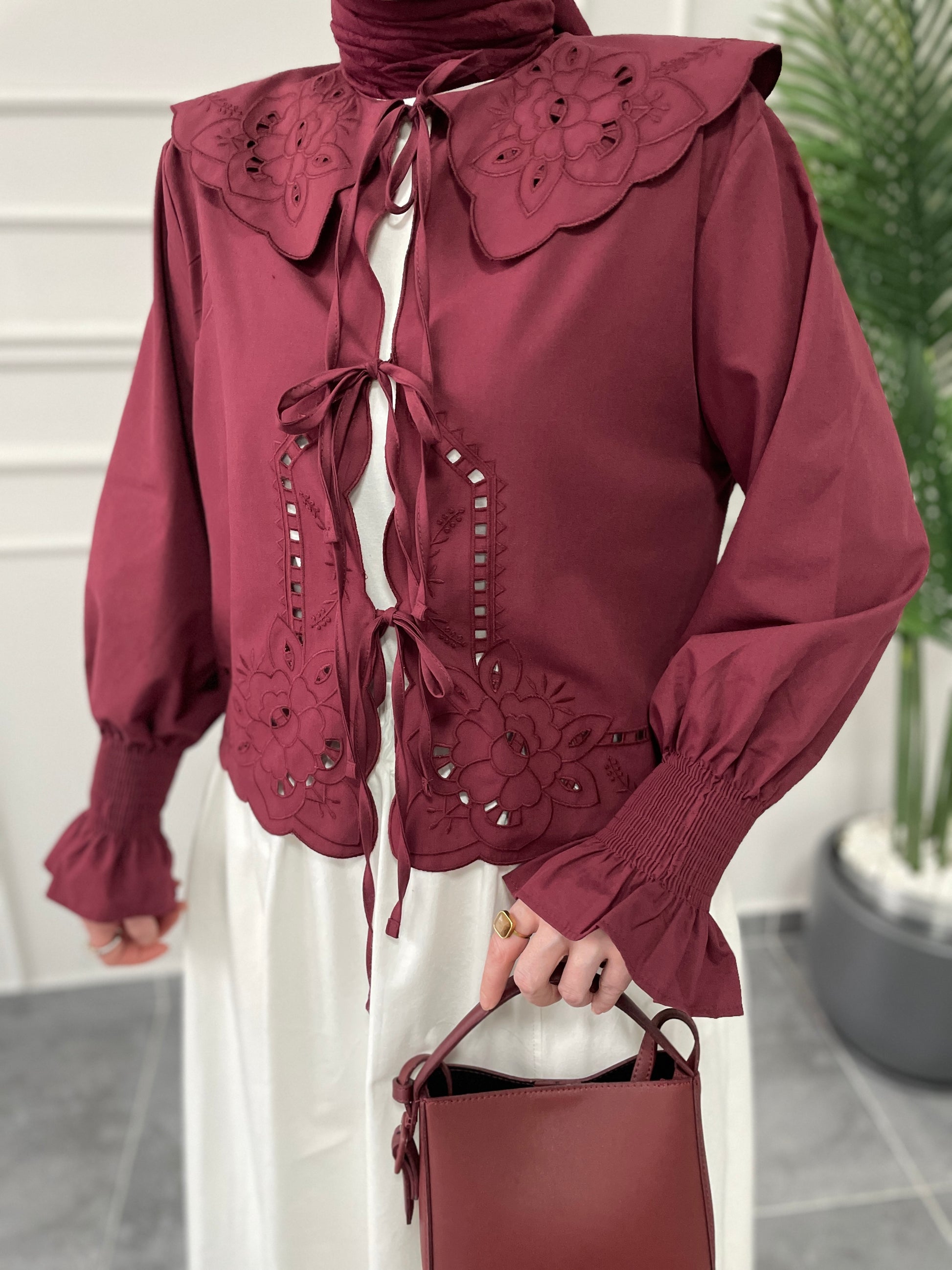 Bebe Yaka Nakışlı Kollar Gipeli Kimono-Bordo