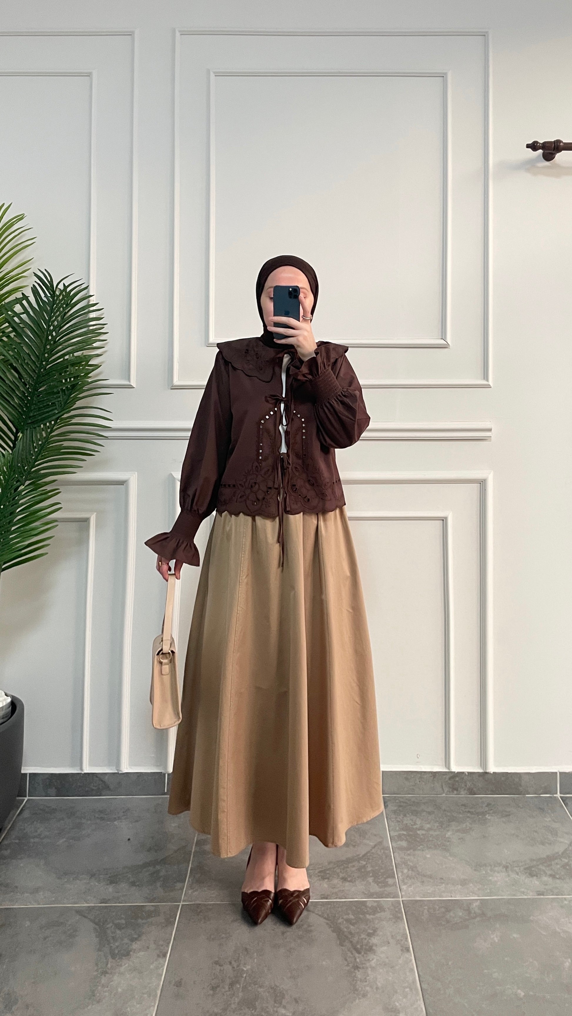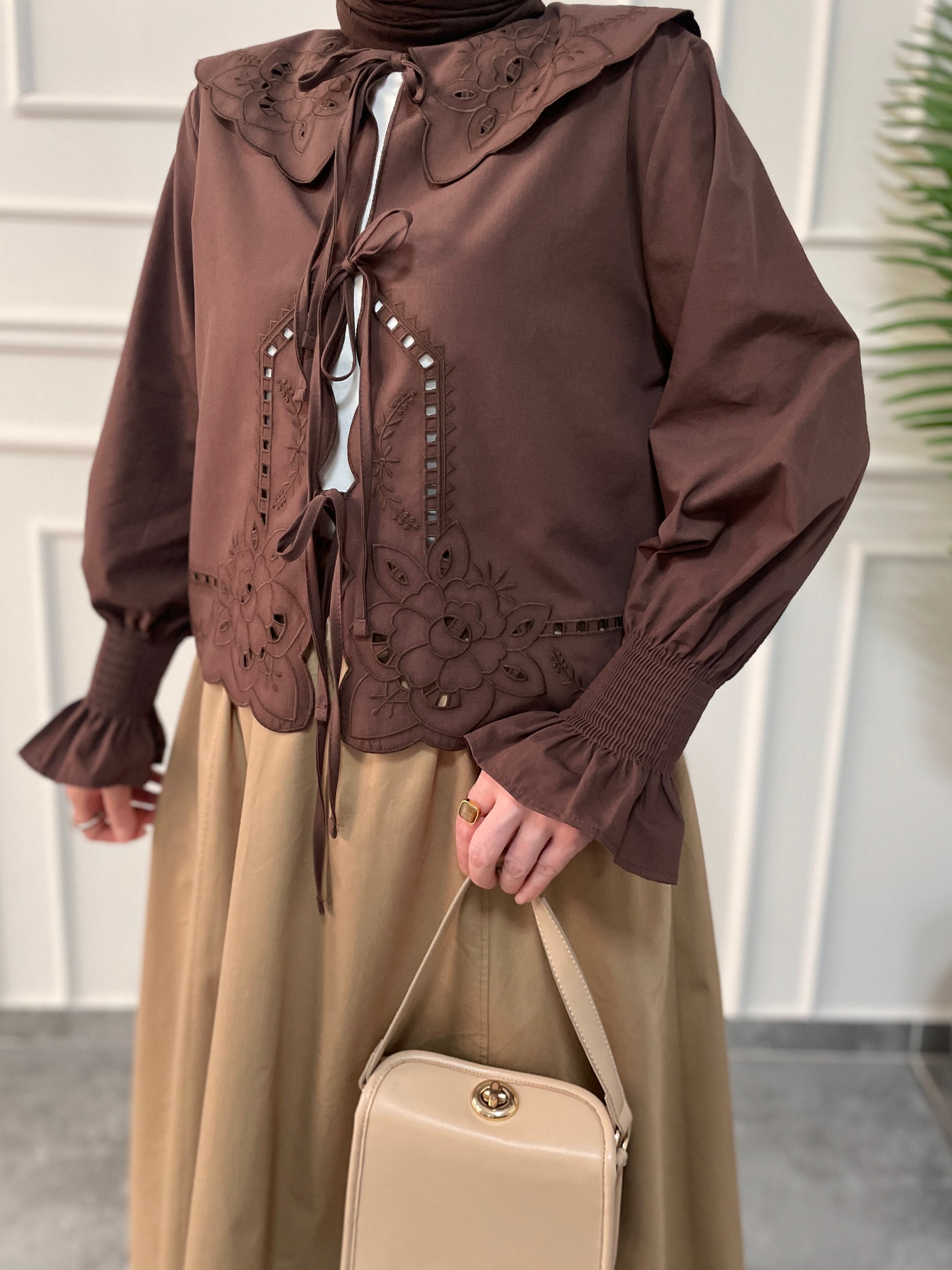 Bebe Yaka Nakışlı Kollar Gipeli Kimono-Kahverengi