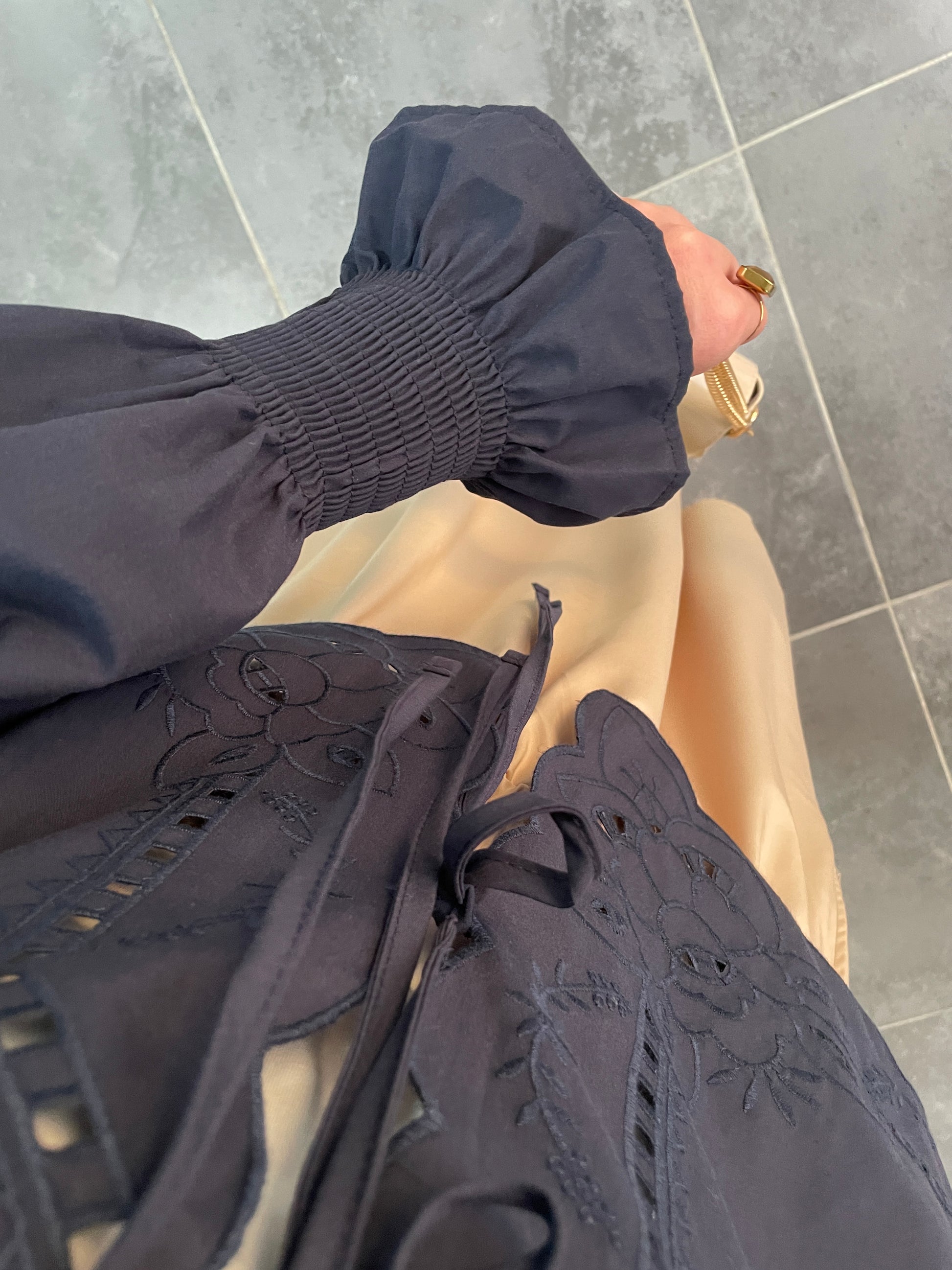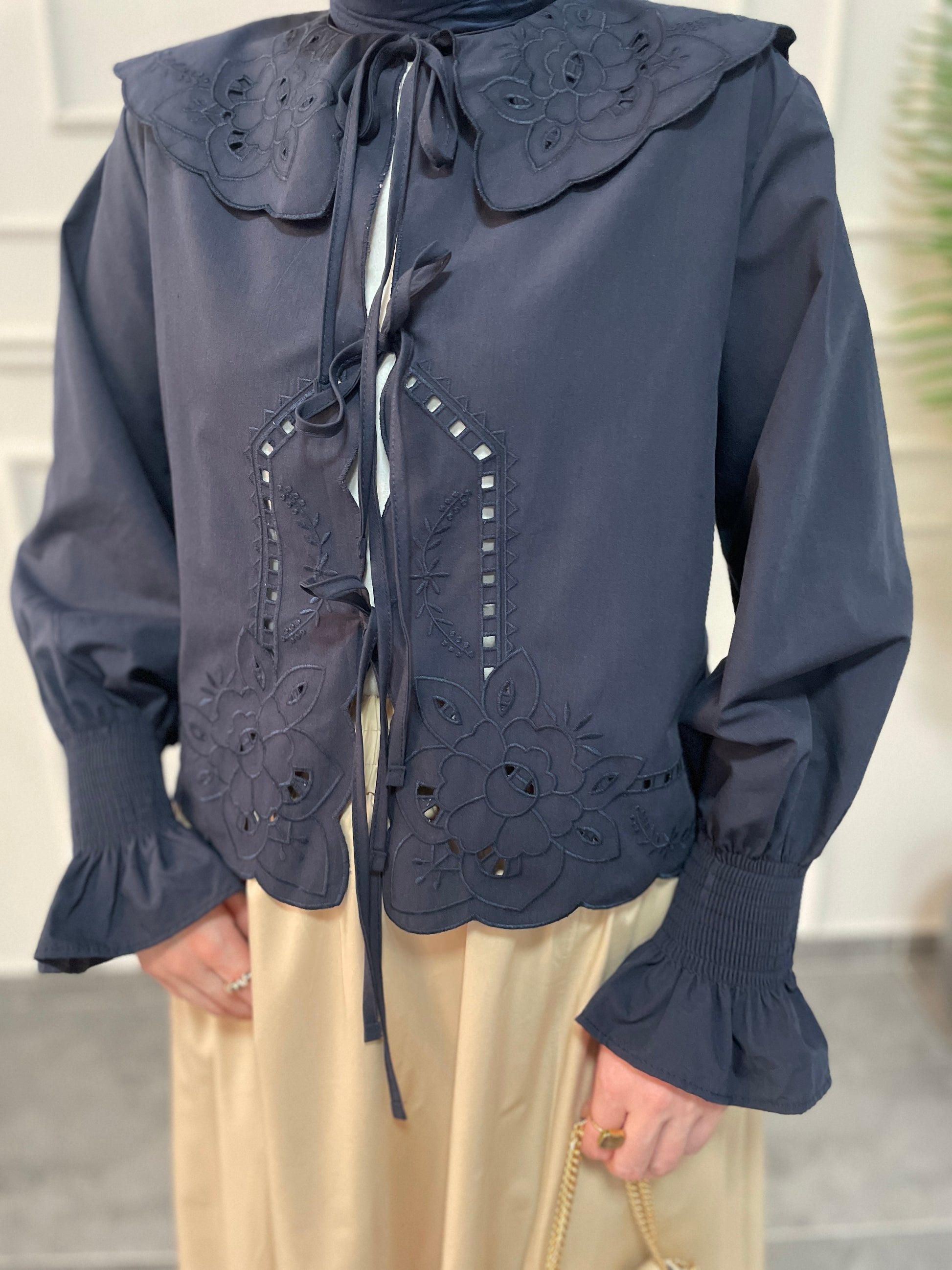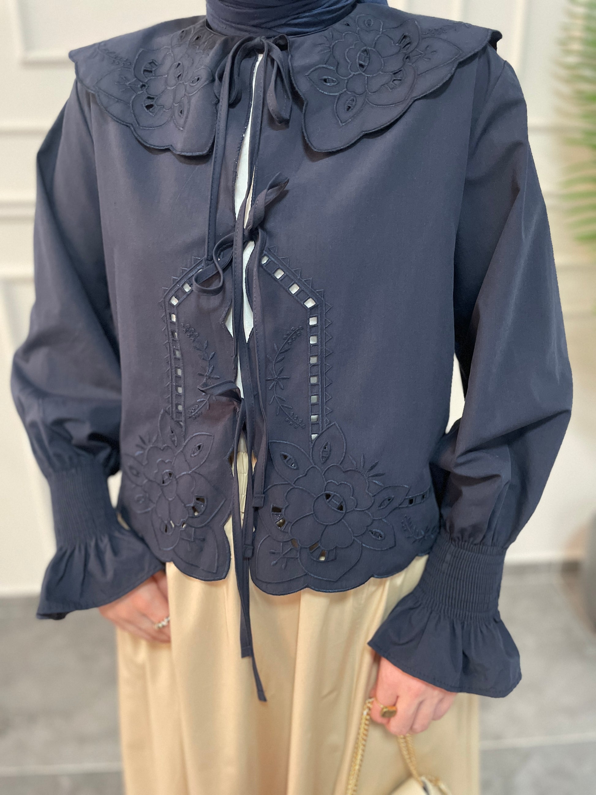 Bebe Yaka Nakışlı Kollar Gipeli Kimono-Lacivert