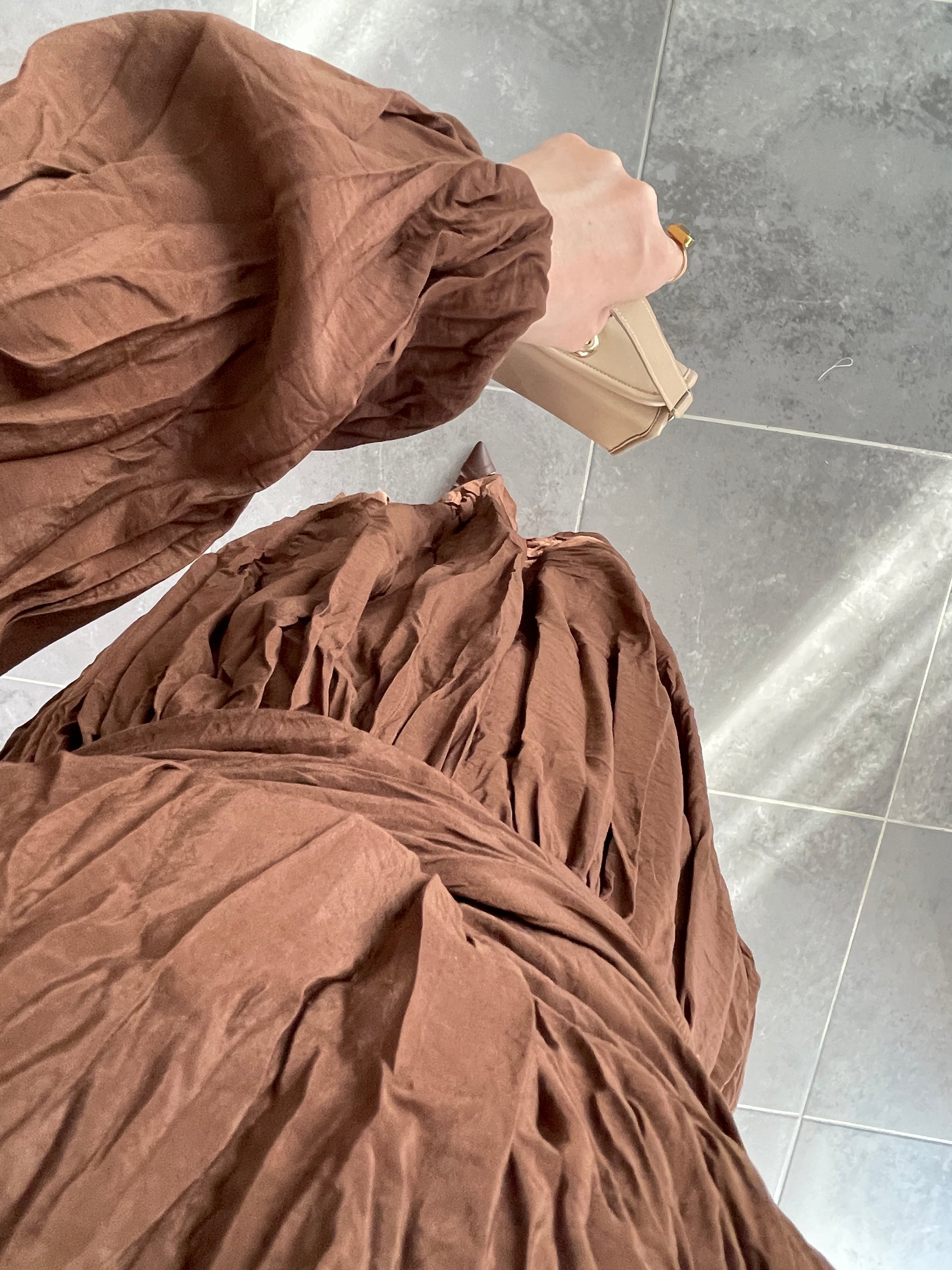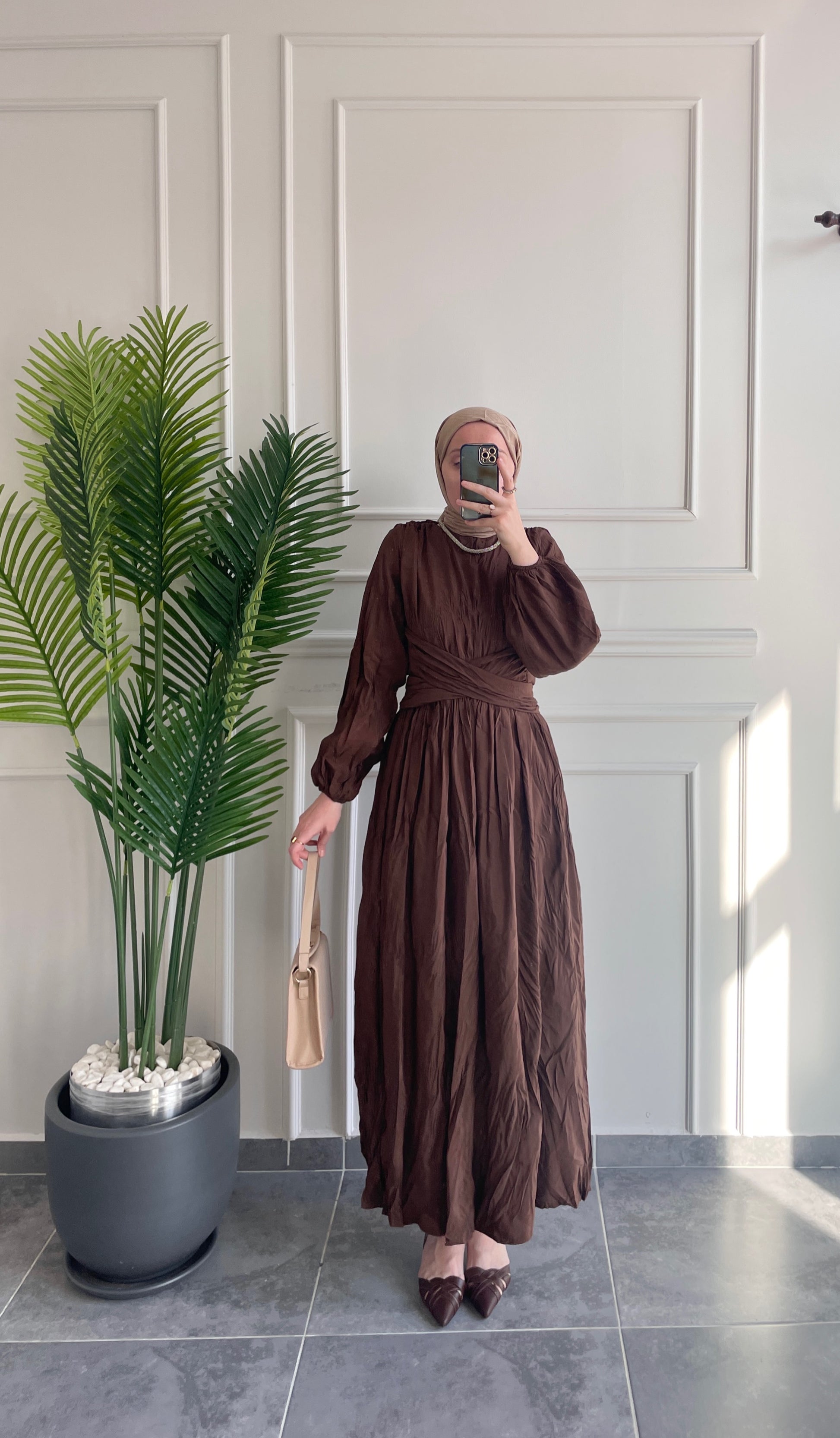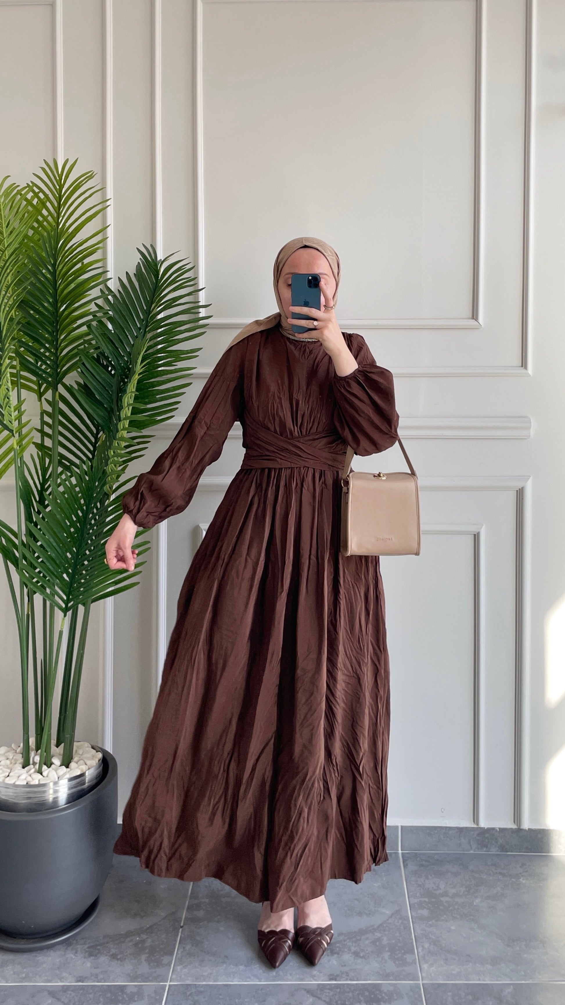 Bel Bağlamalı Kraş Elbise-Kahve