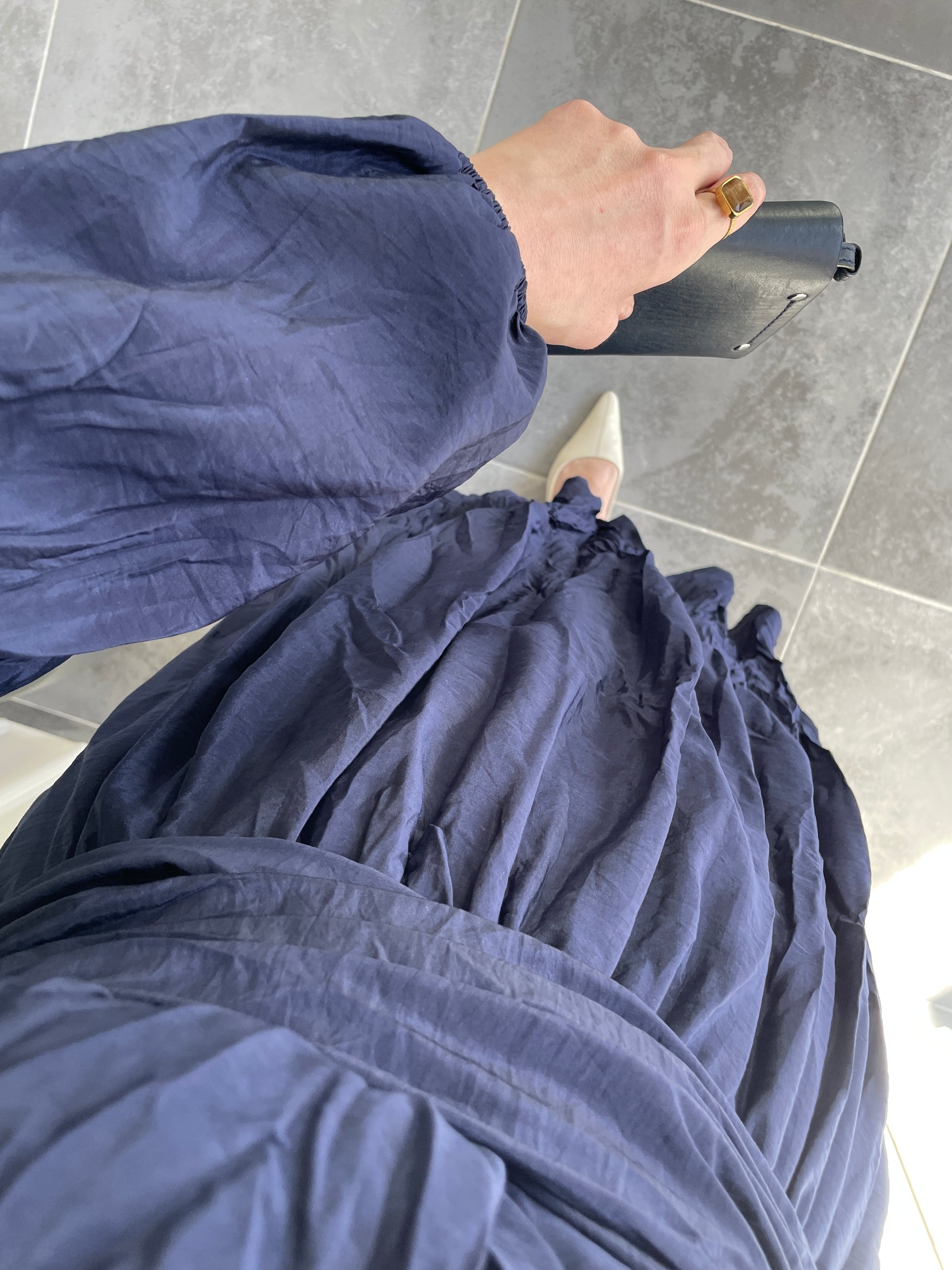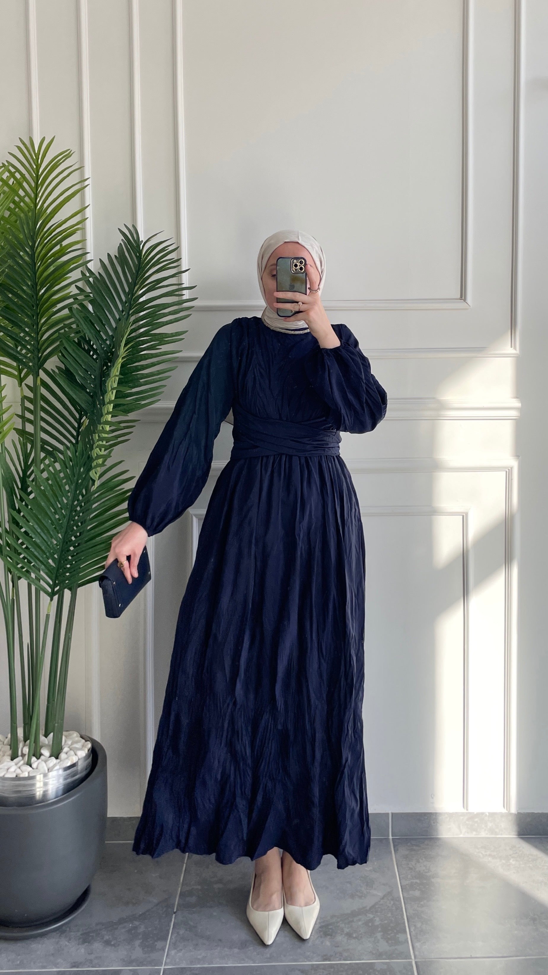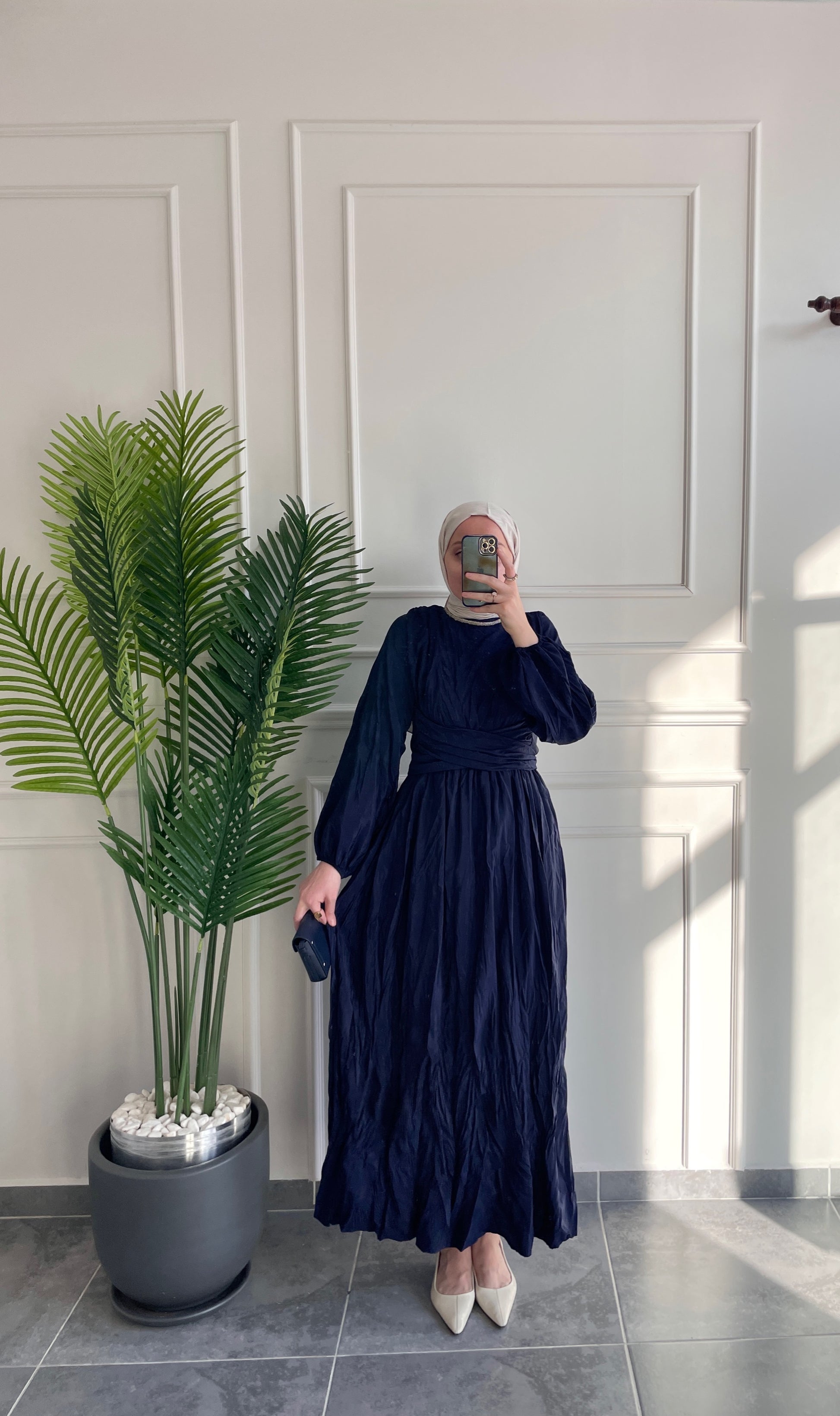 Bel Bağlamalı Kraş Elbise-Lacivert