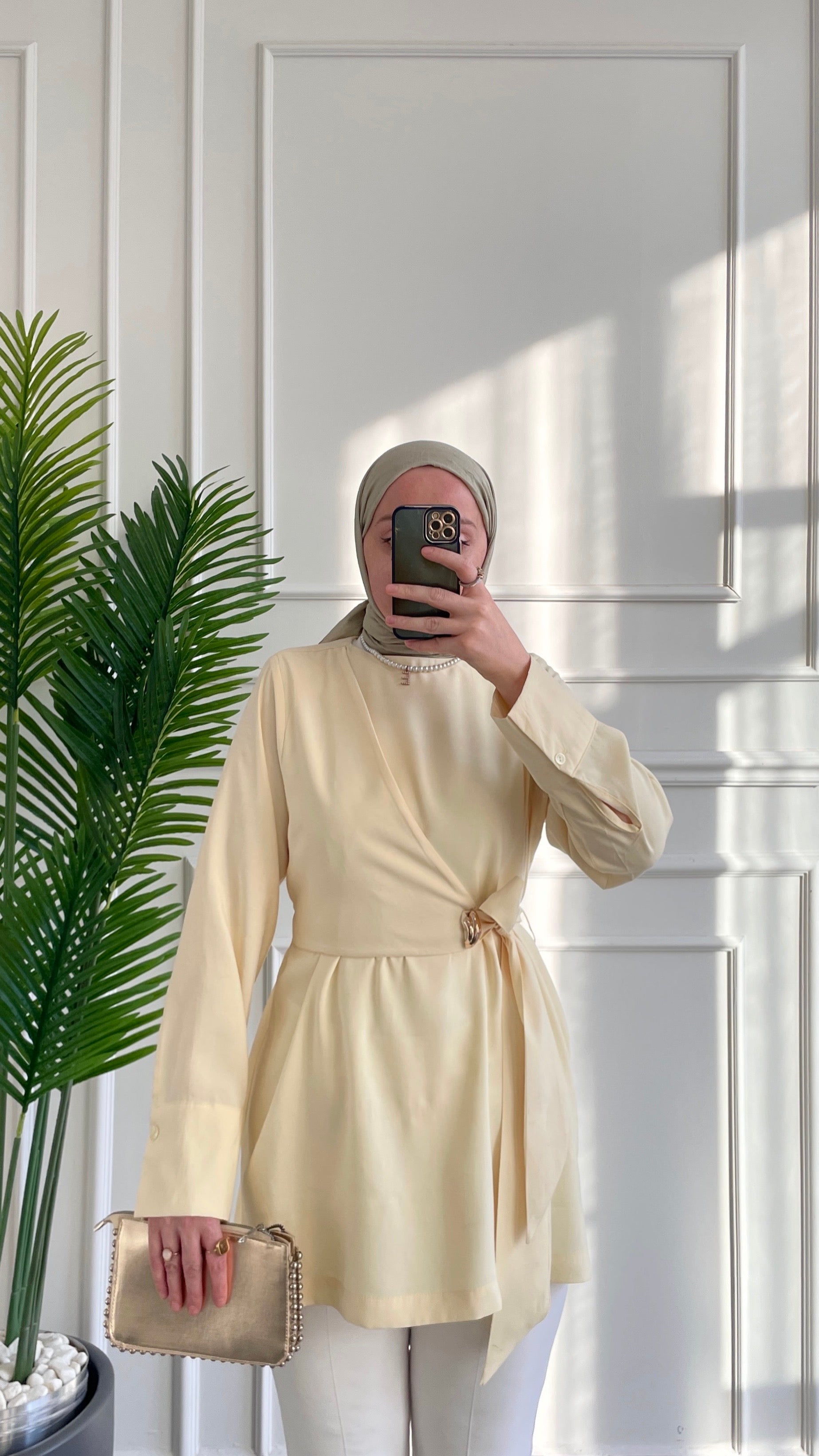 Bronş Detaylı Bel Bağlama TasarımTunik-Soft Sarı