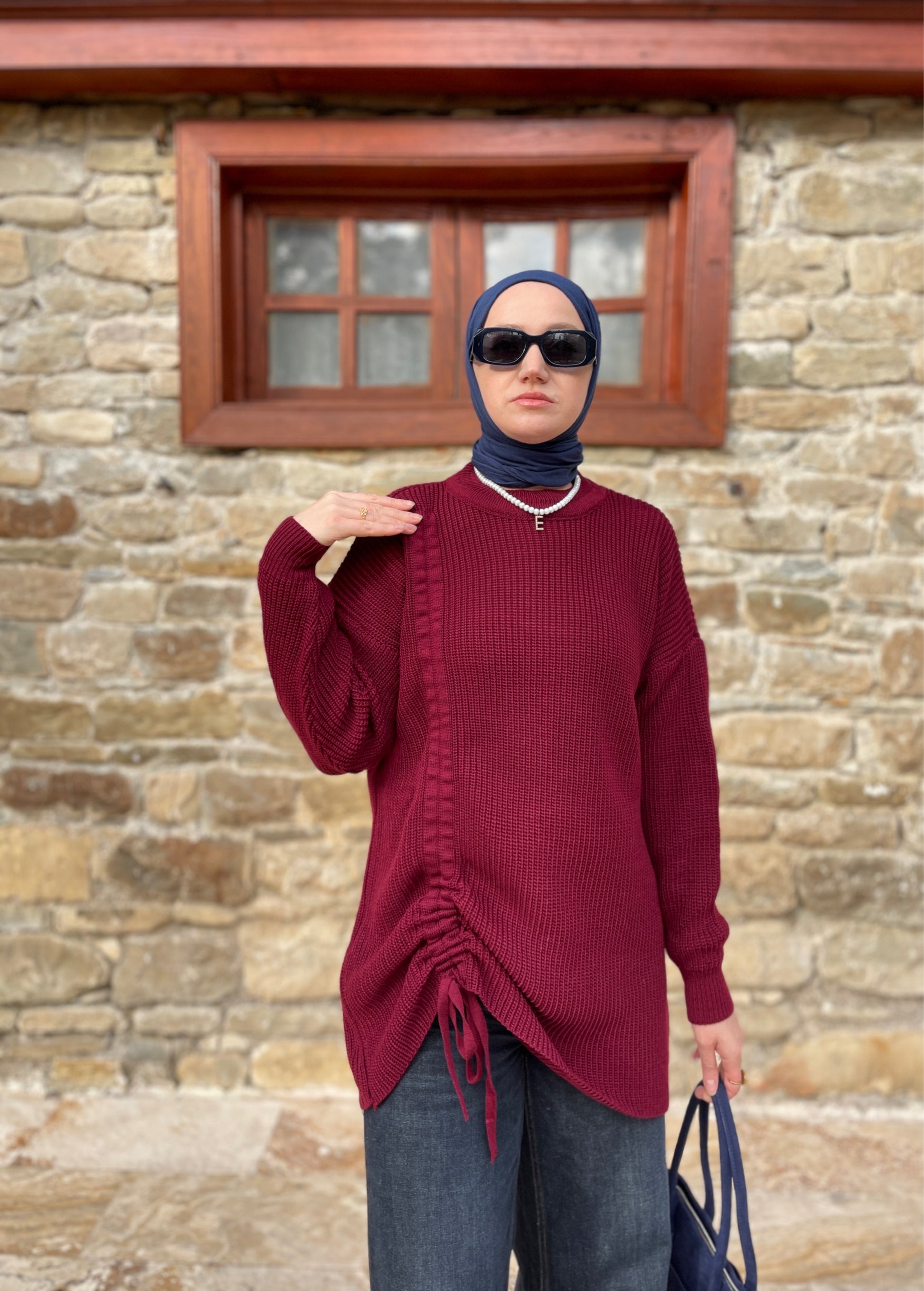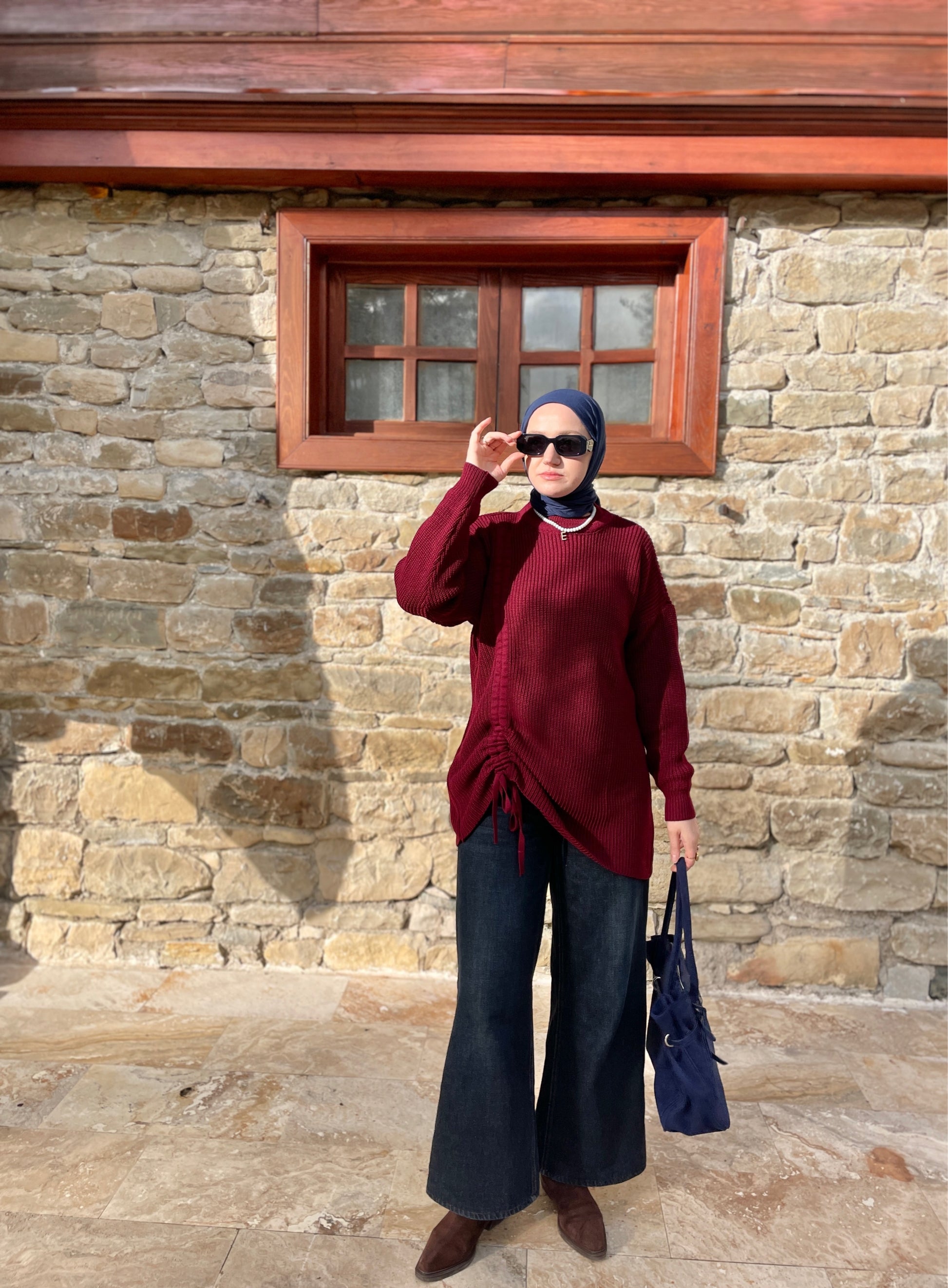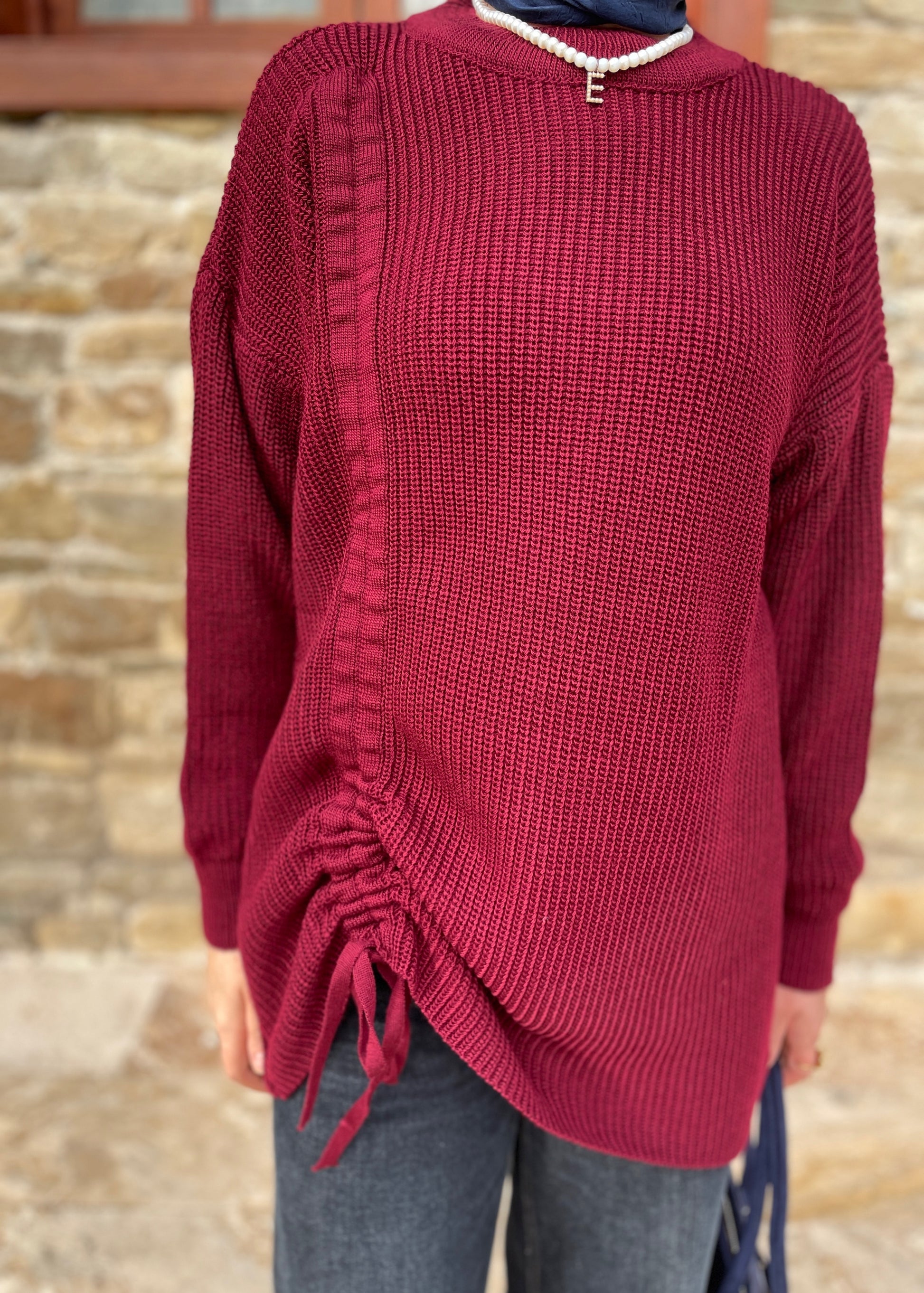Büzgü Detaylı Triko Kazak Bordo