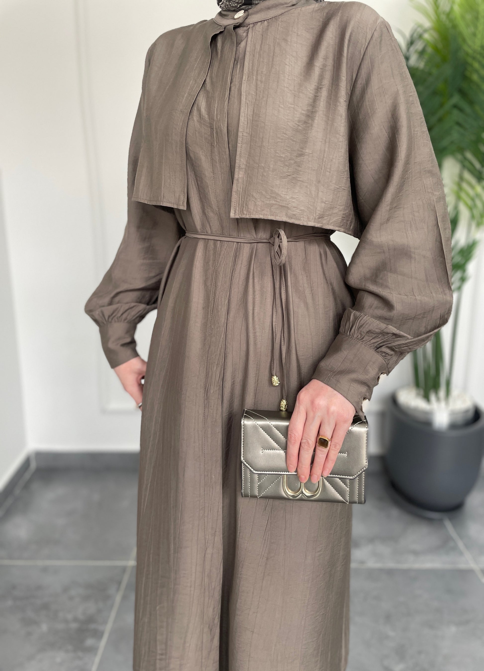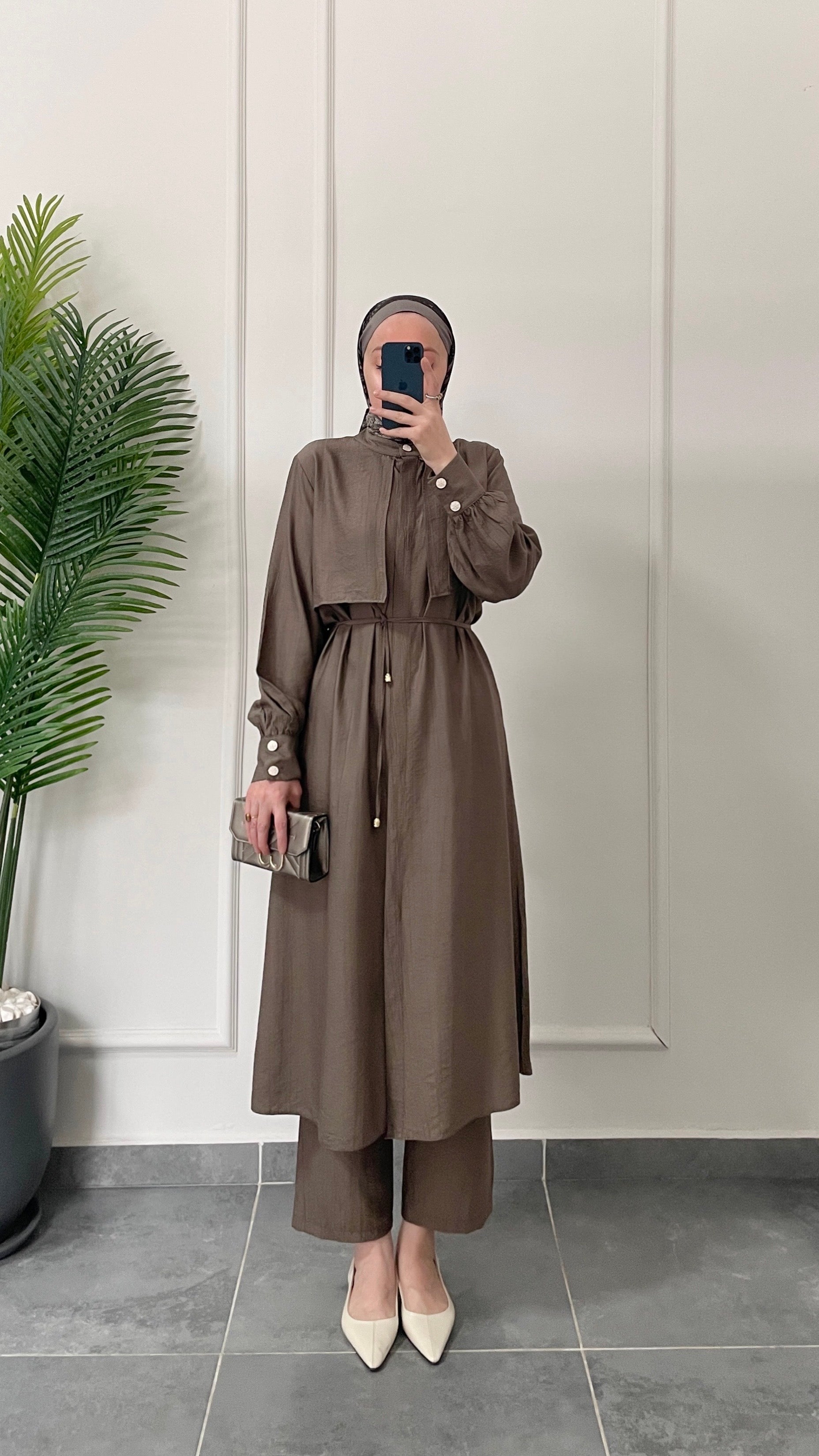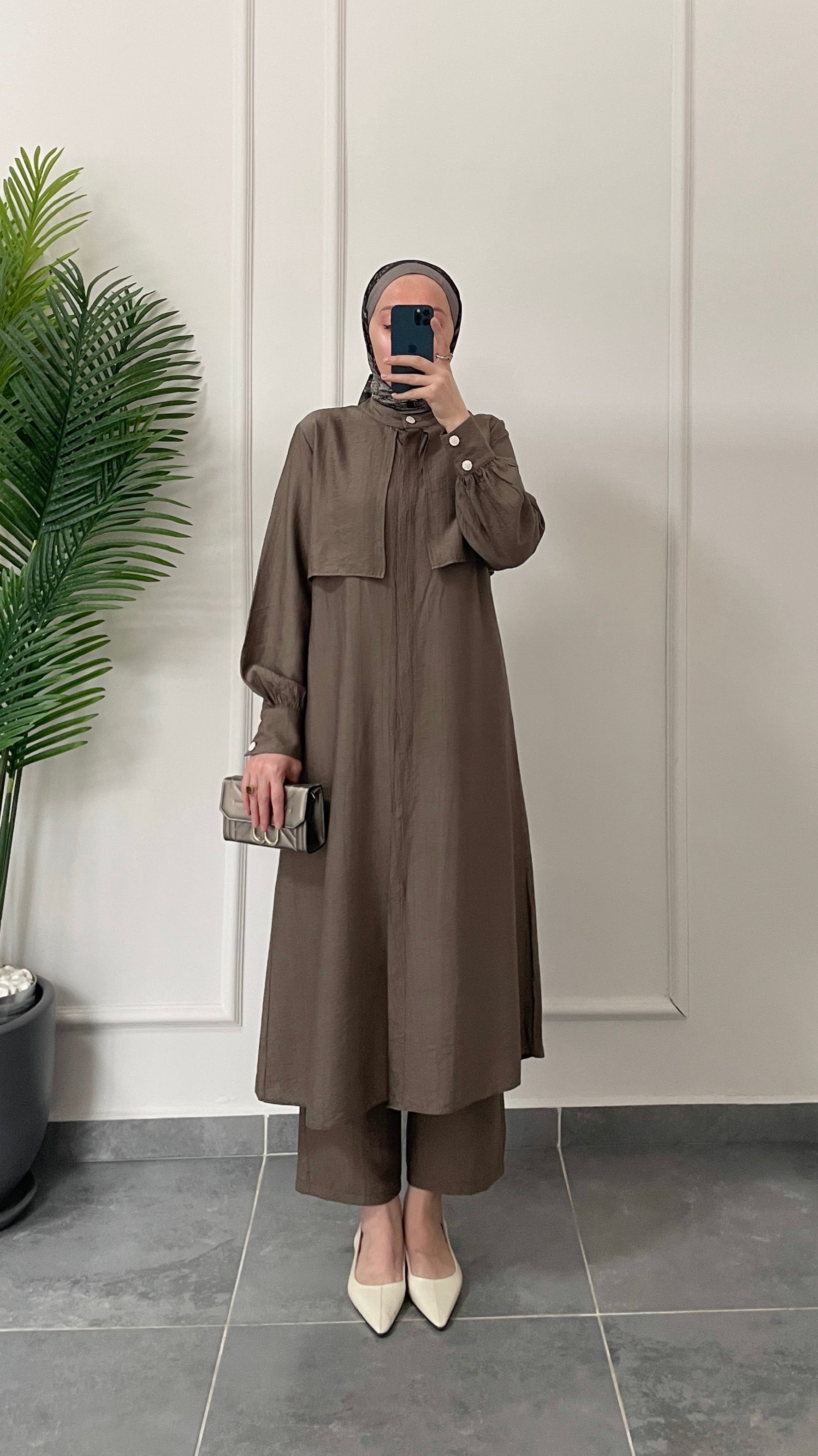 Çilek Kumaş Tunikli Takım-Boz Kahve