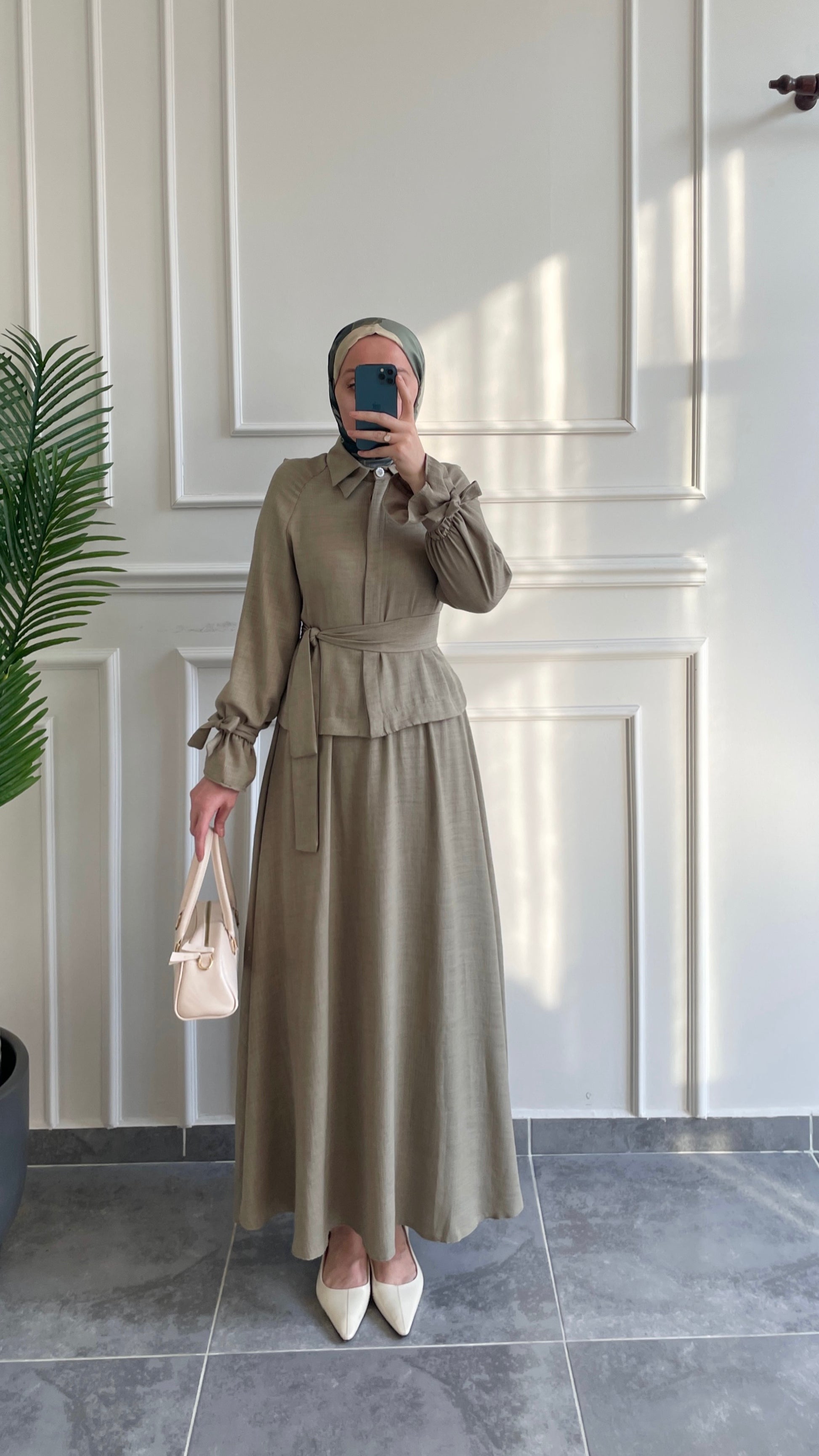 Dolunay Çift Yaka Tasarım Keten Etekli Takım-Yeşil