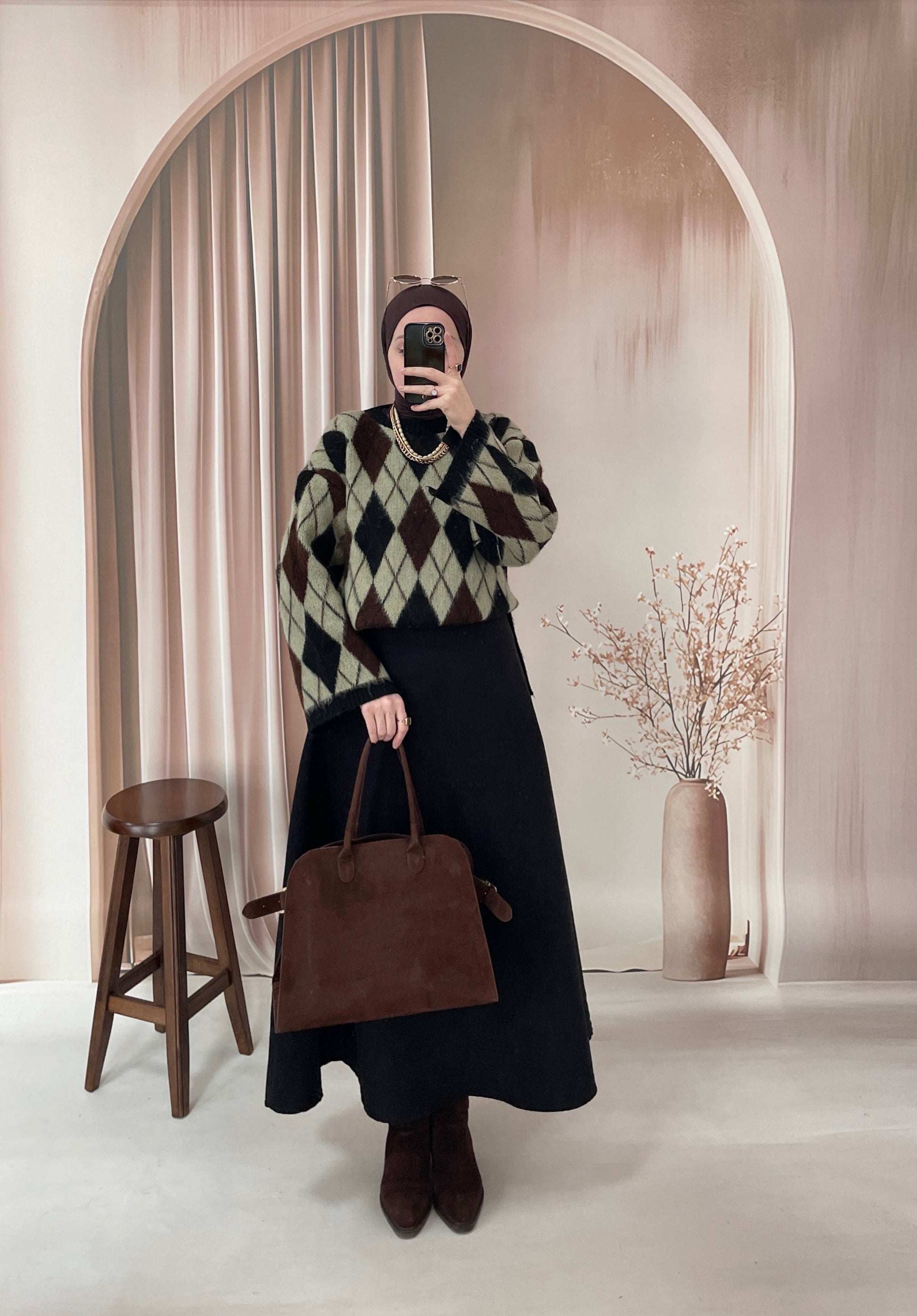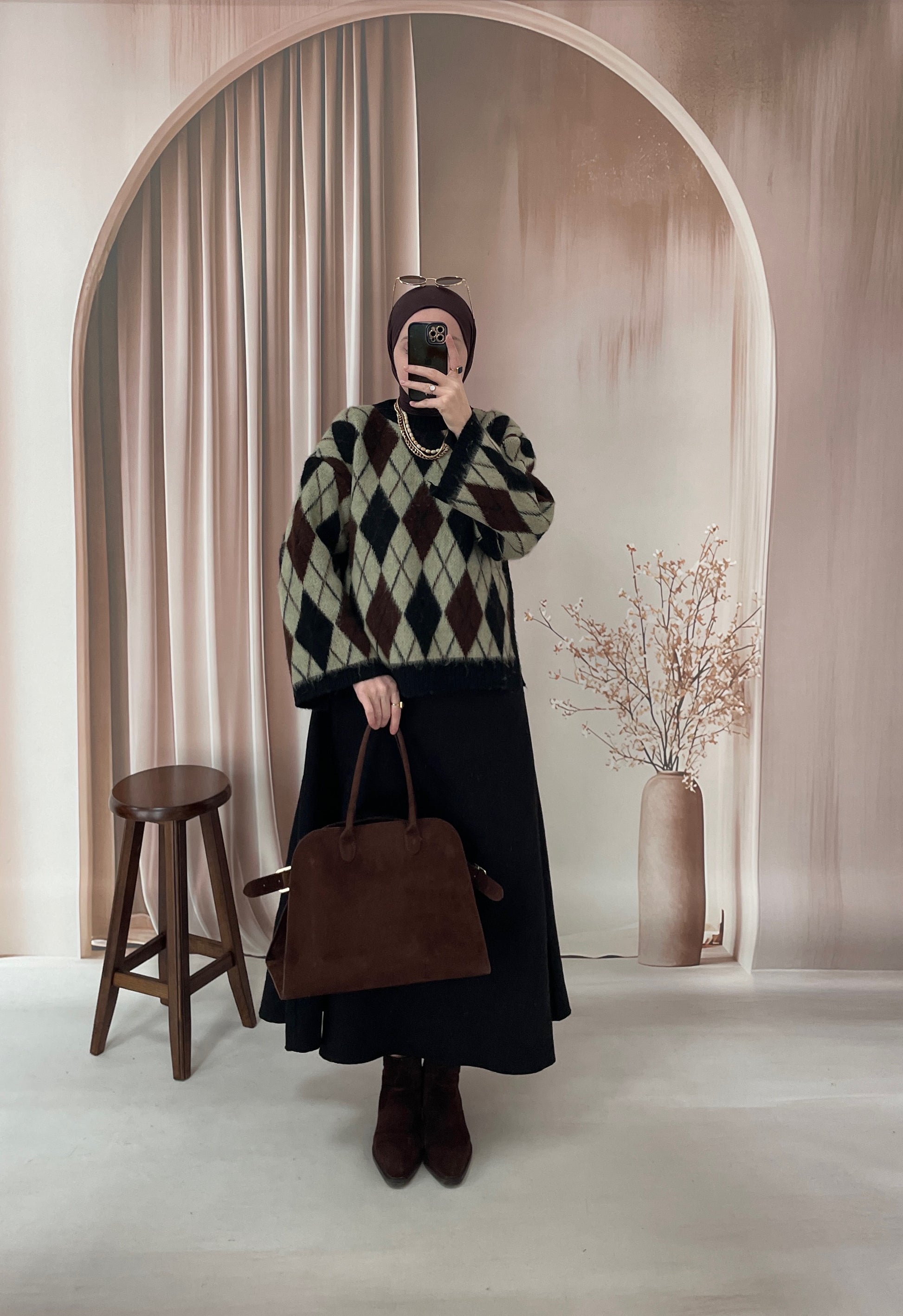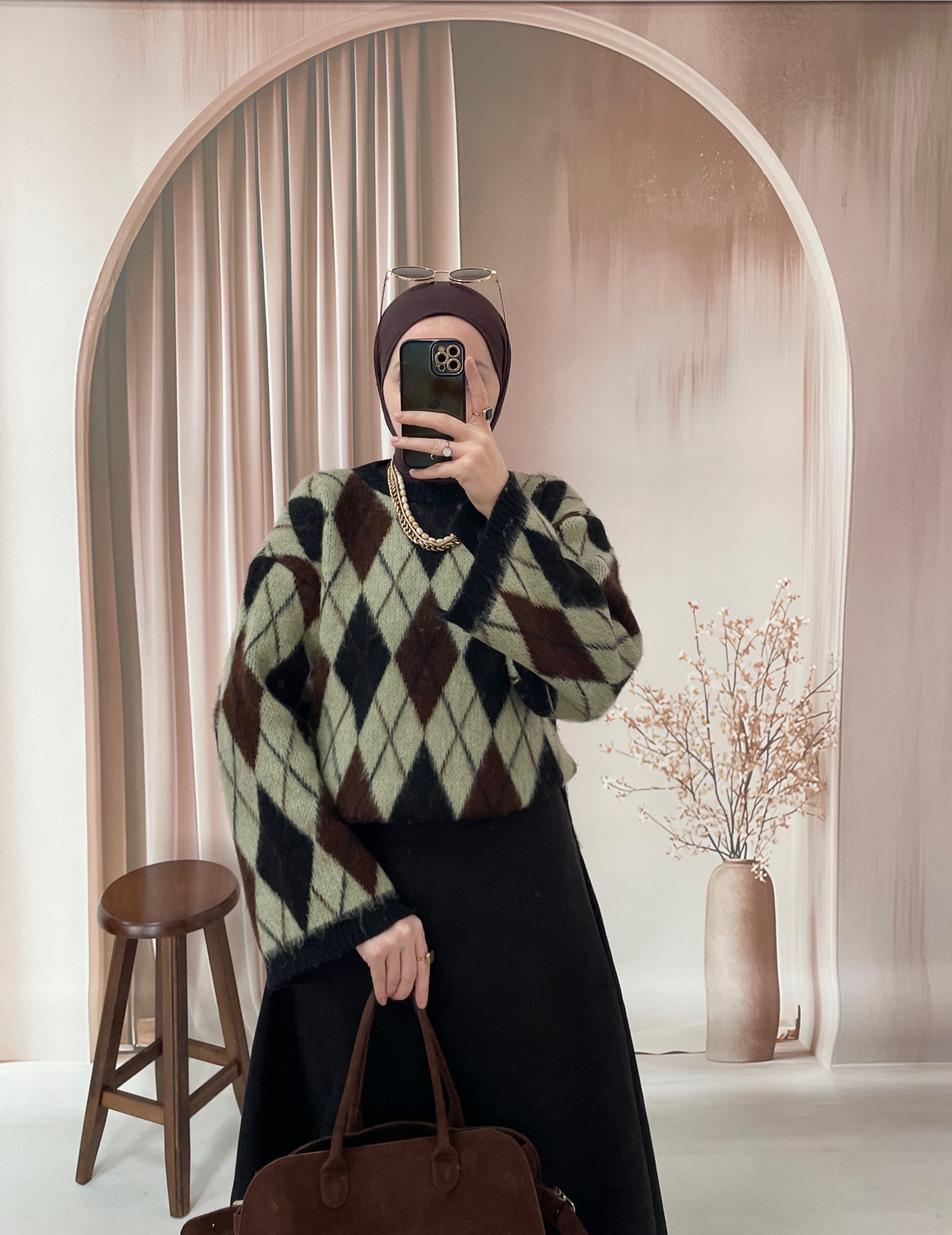 Geniş Kol Tasarım Baklava Desen Kazak Yeşil&Siyah