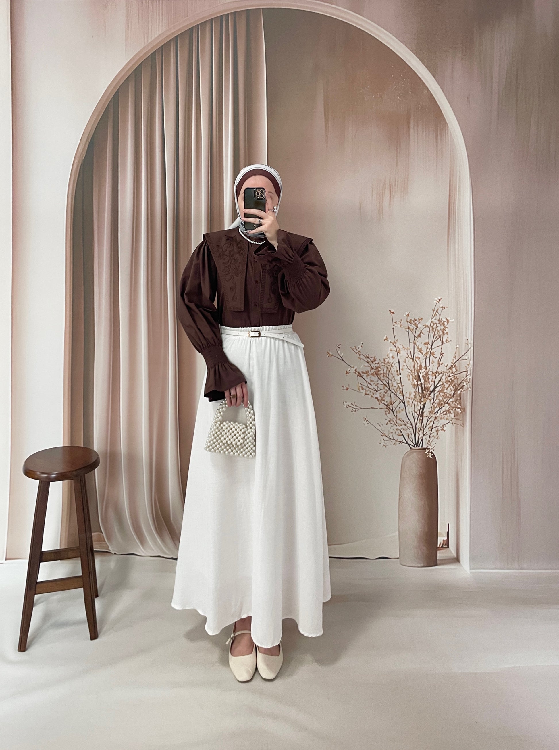 Geniş Yakalı Nakışlı Vintage Gömlek Kahverengi
