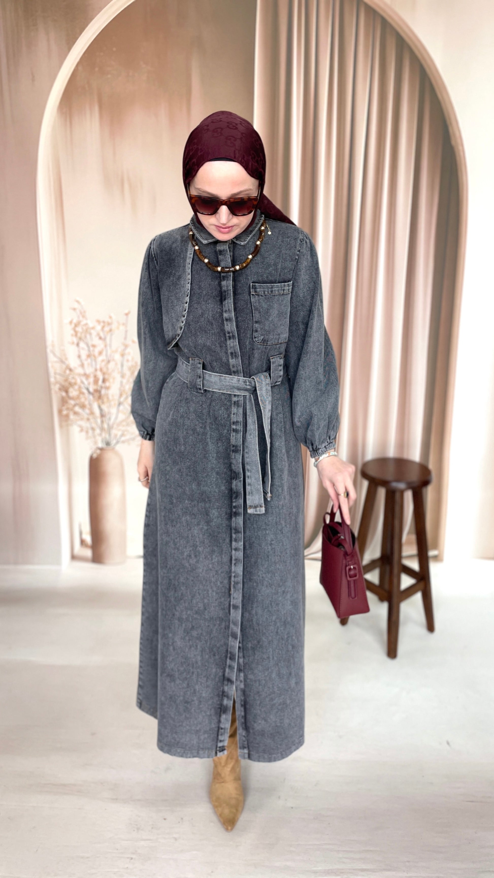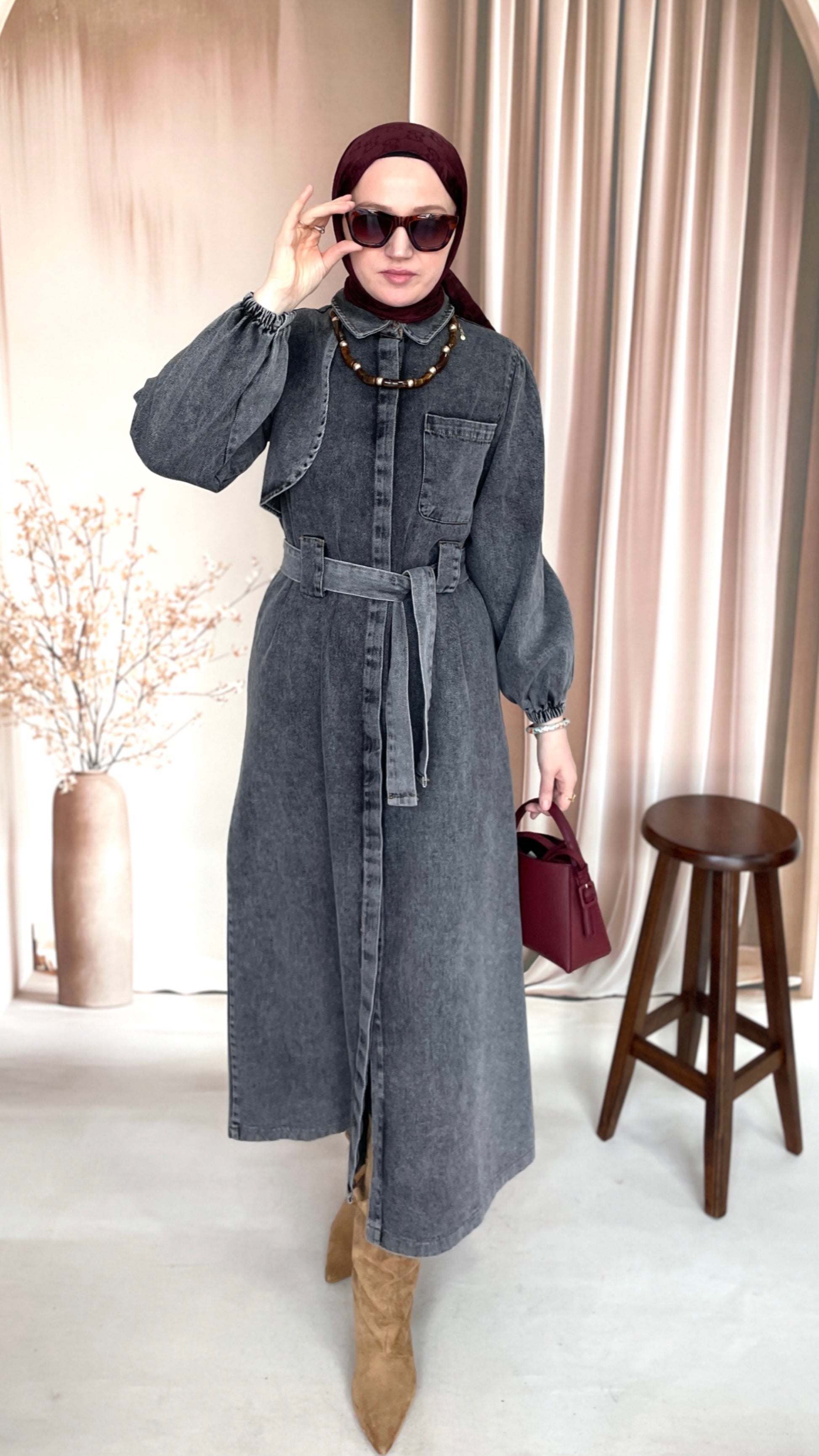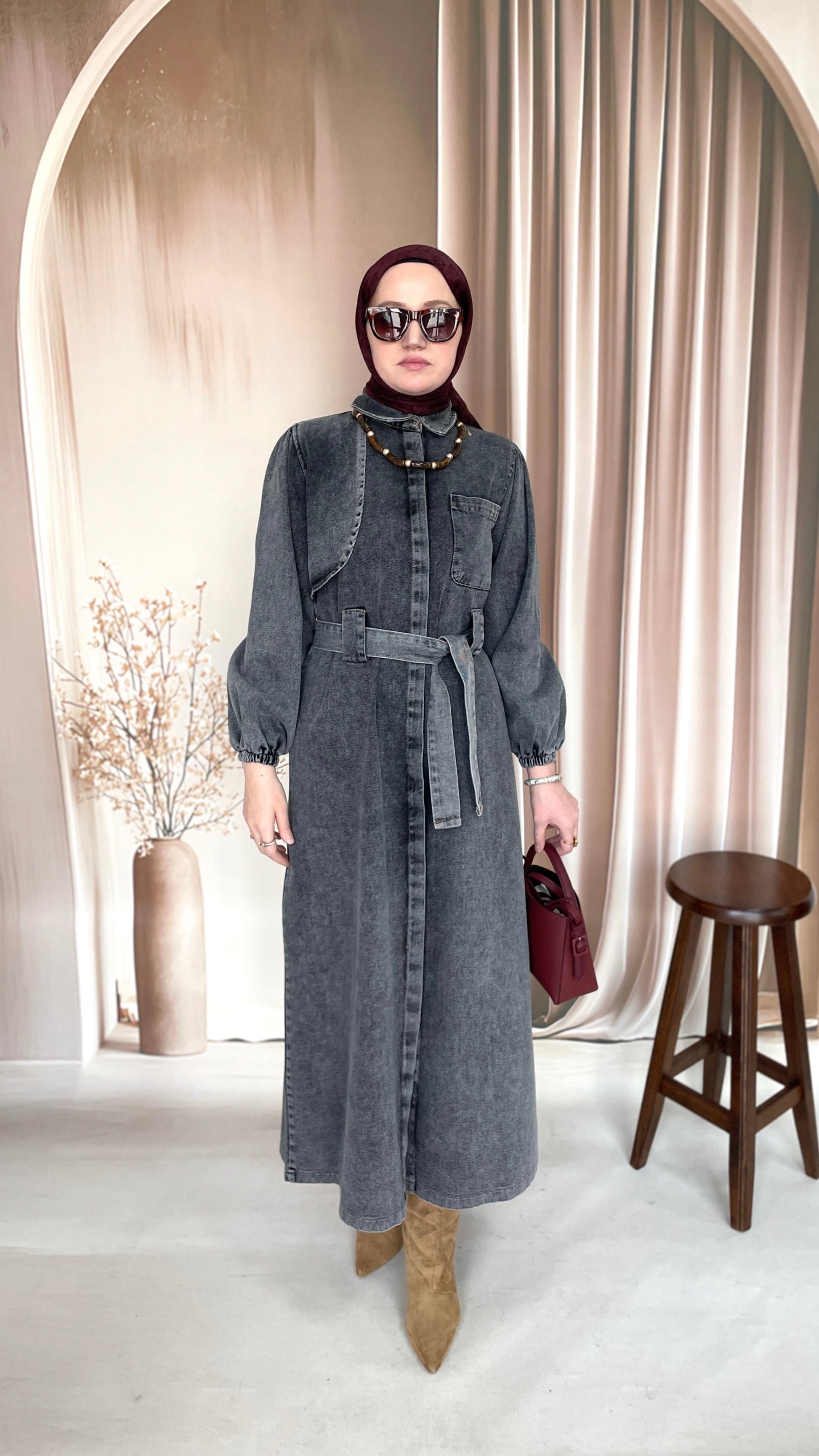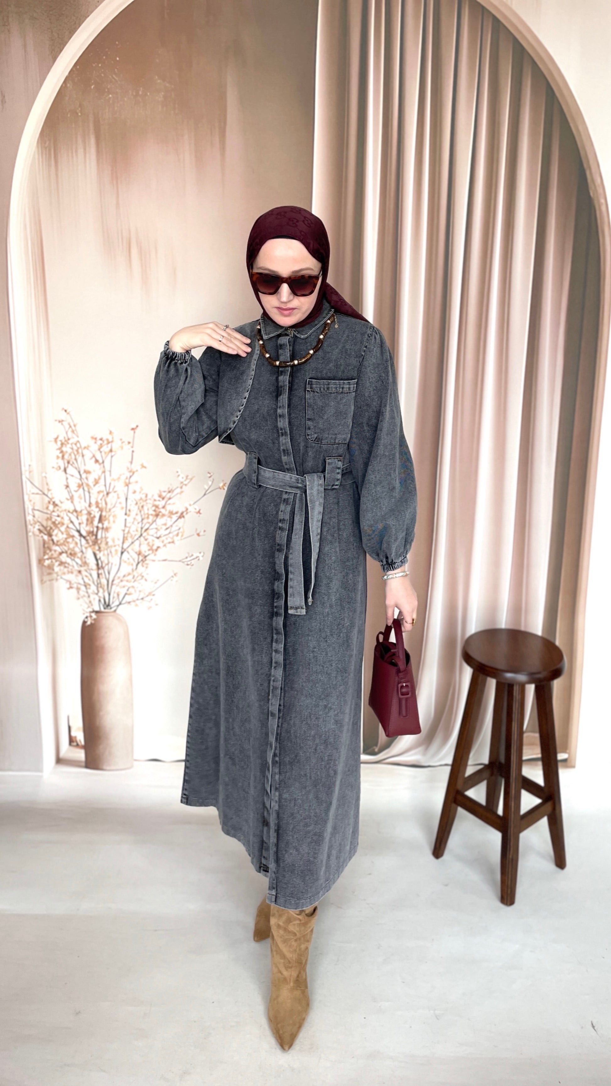 Gizli Patlı Pelerinli Denim Elbise Antrasit