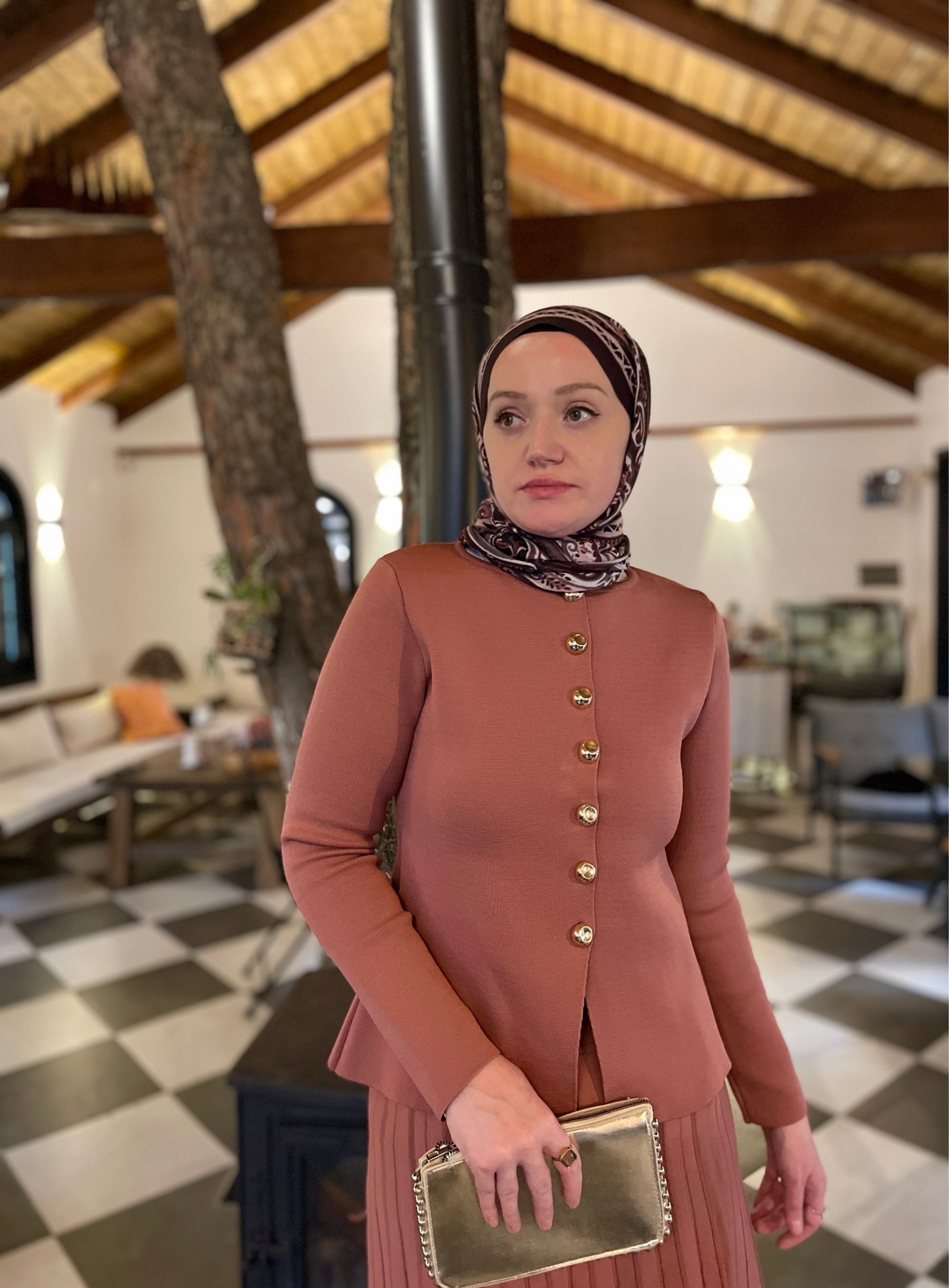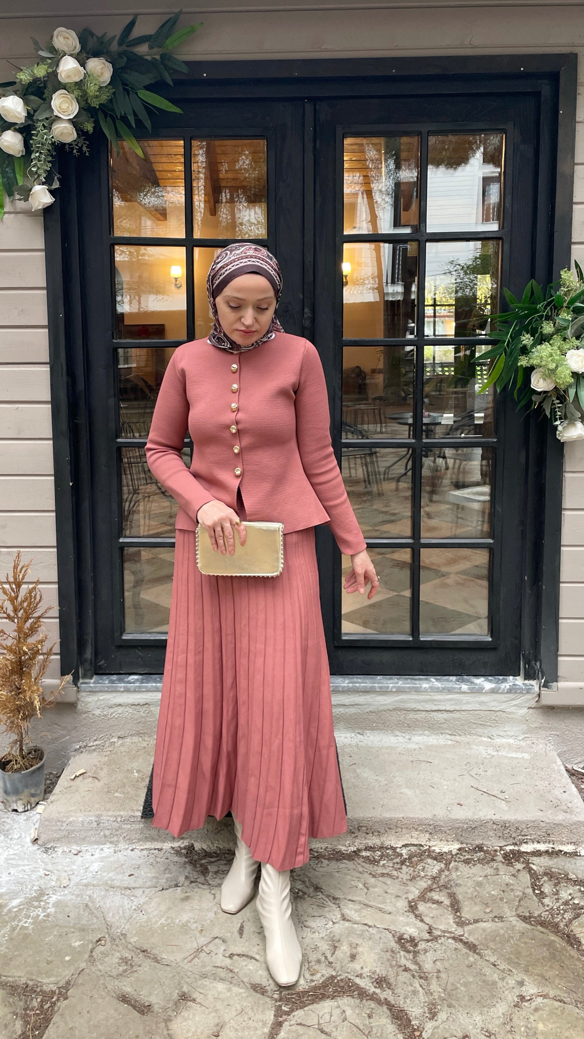 Gold Düğmeli Piliseli Etekli Triko Takım Somon