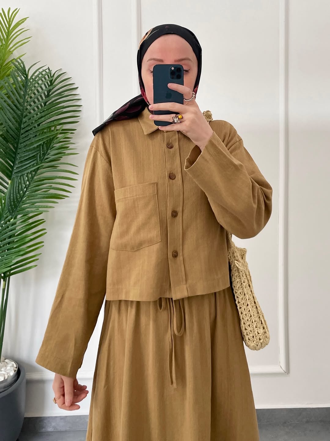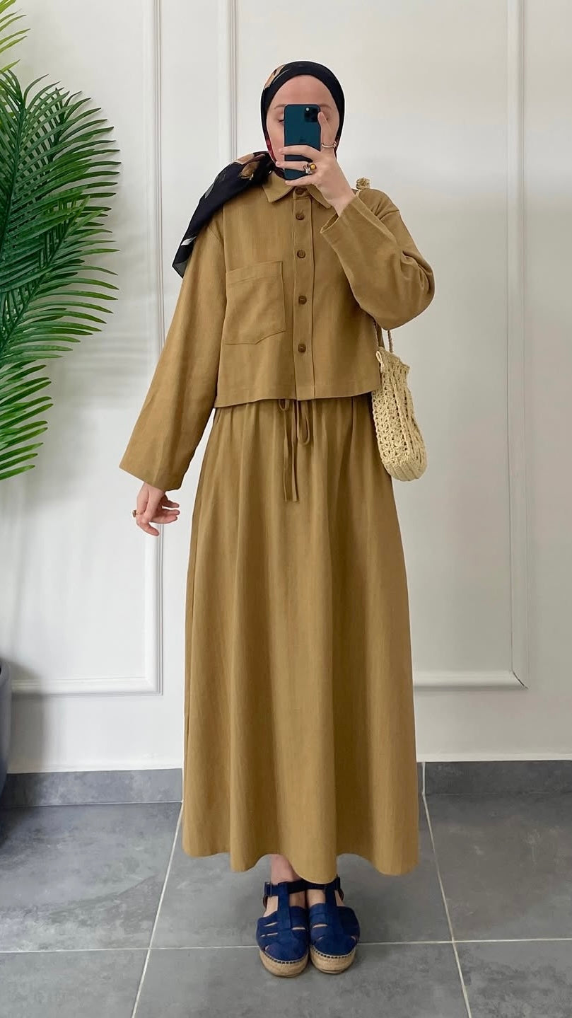 Ham Keten Düğmeli Etekli Takım-Hardal