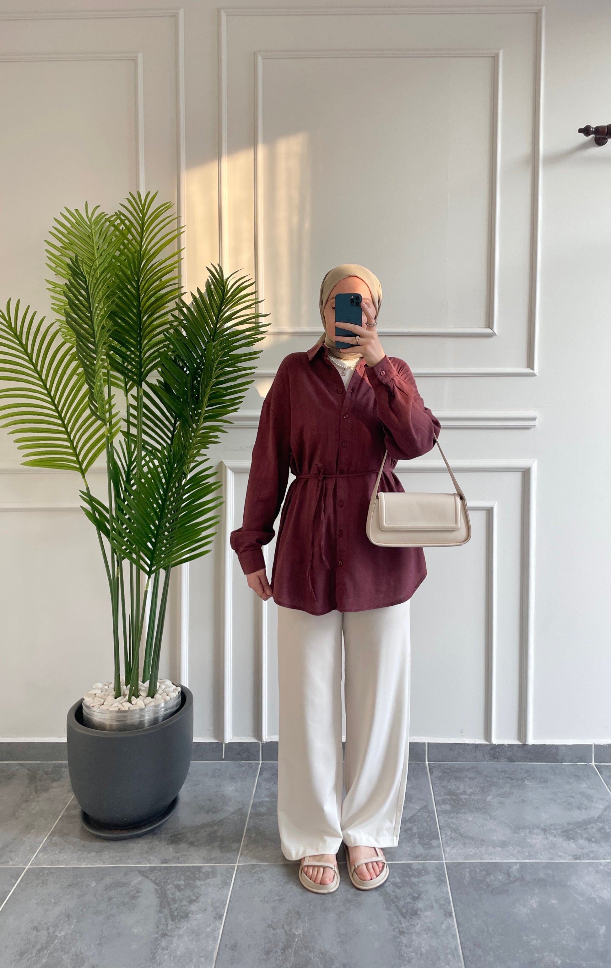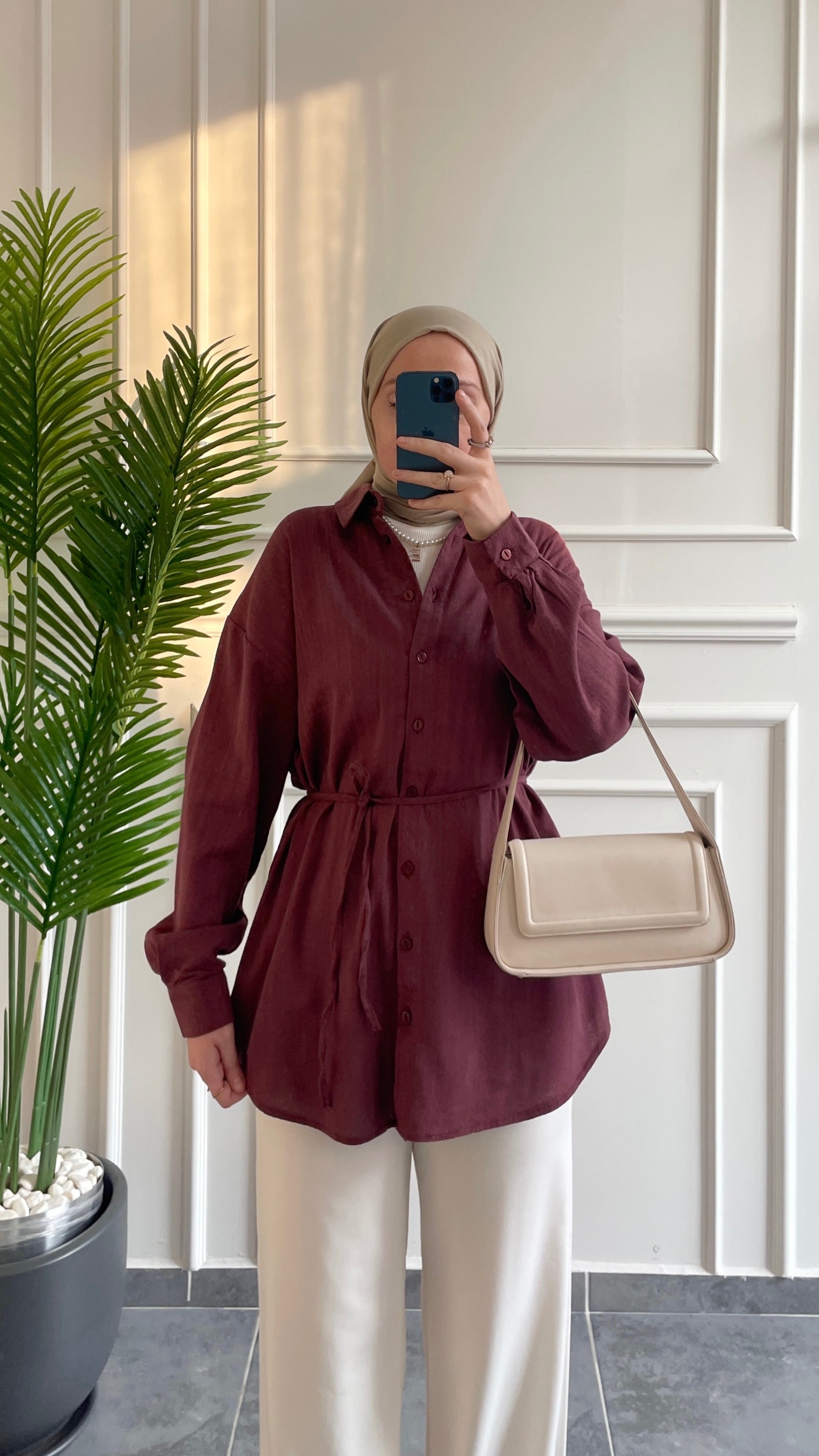 Ham Keten Seyyar Kemerli Gömlek-Bordo