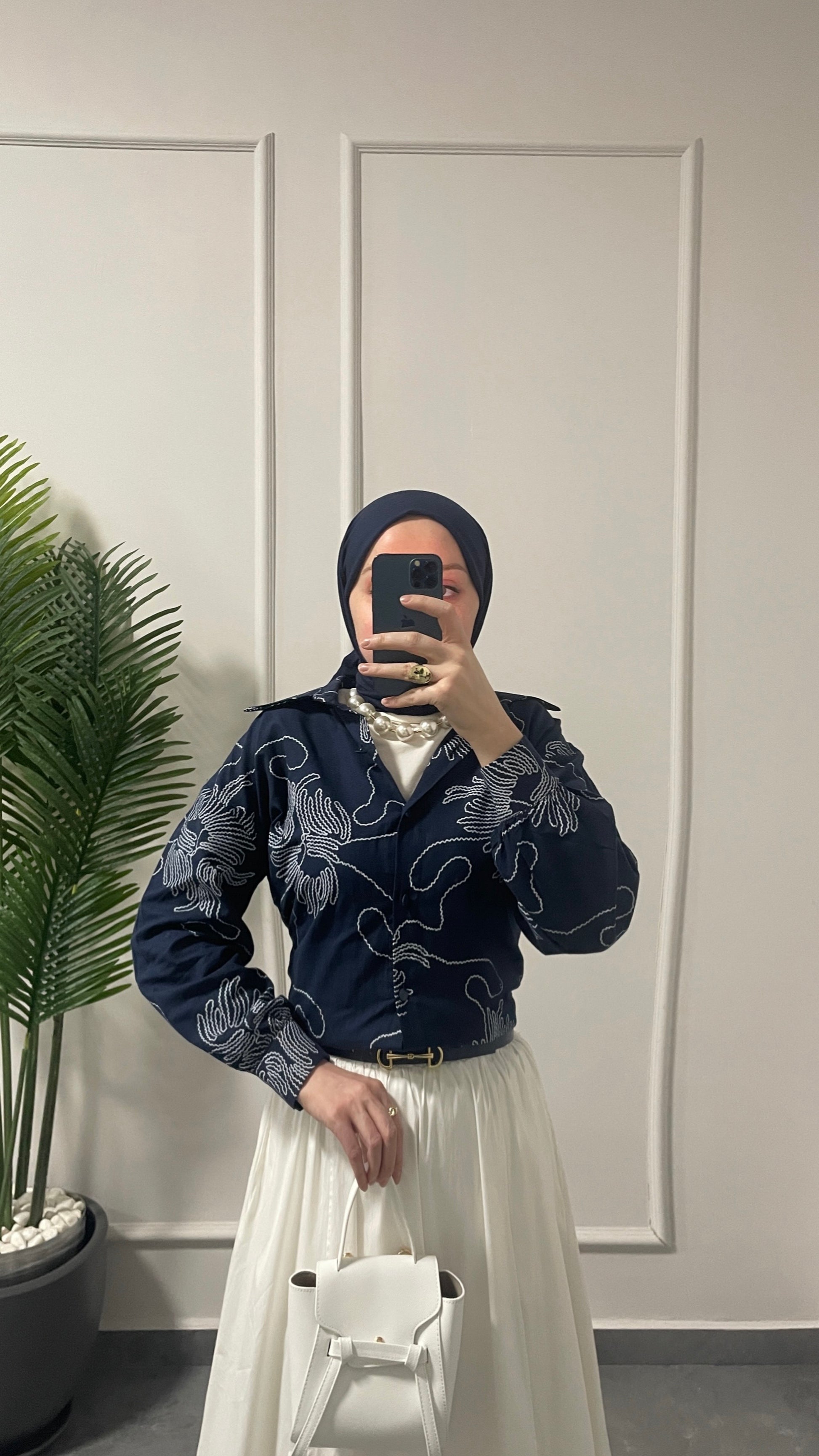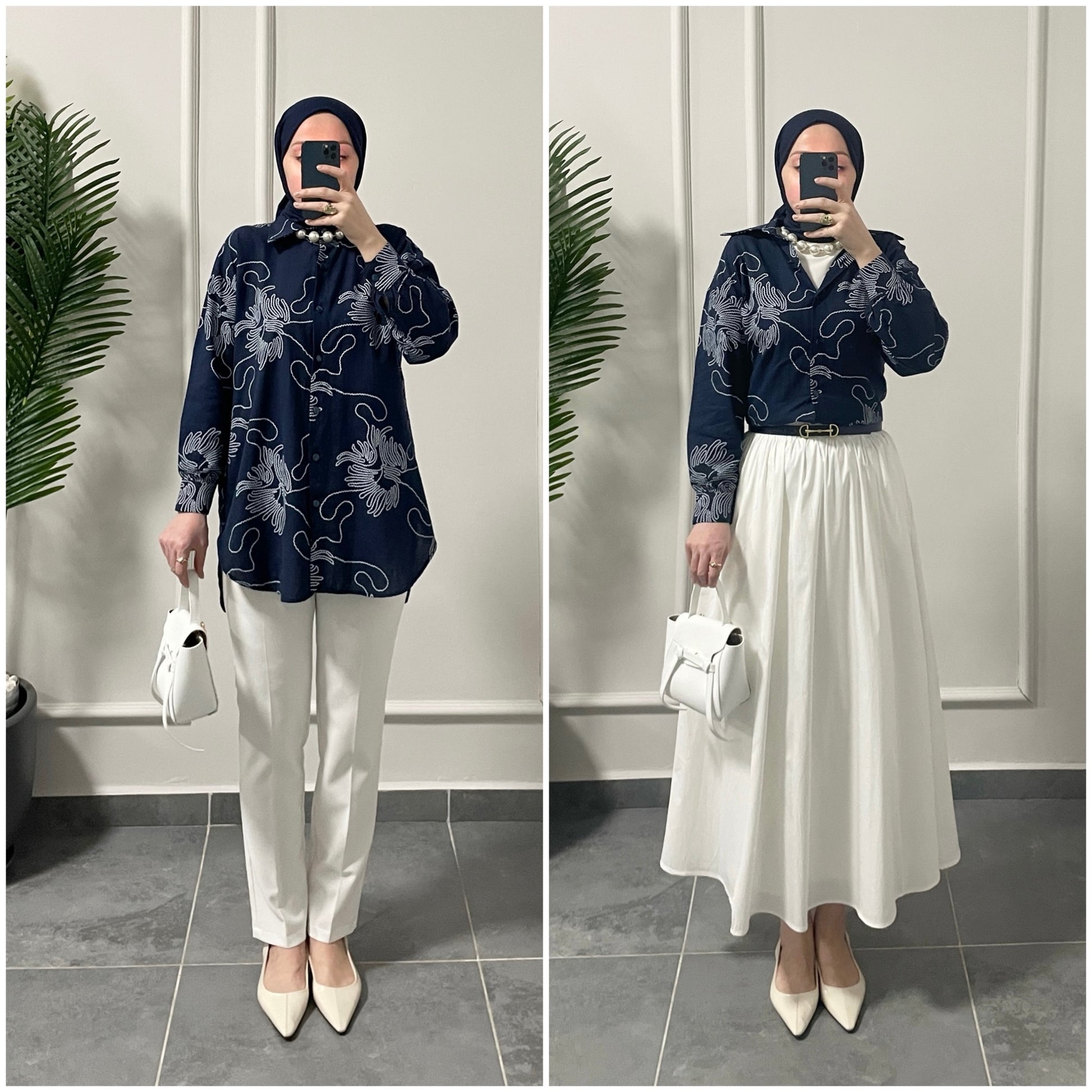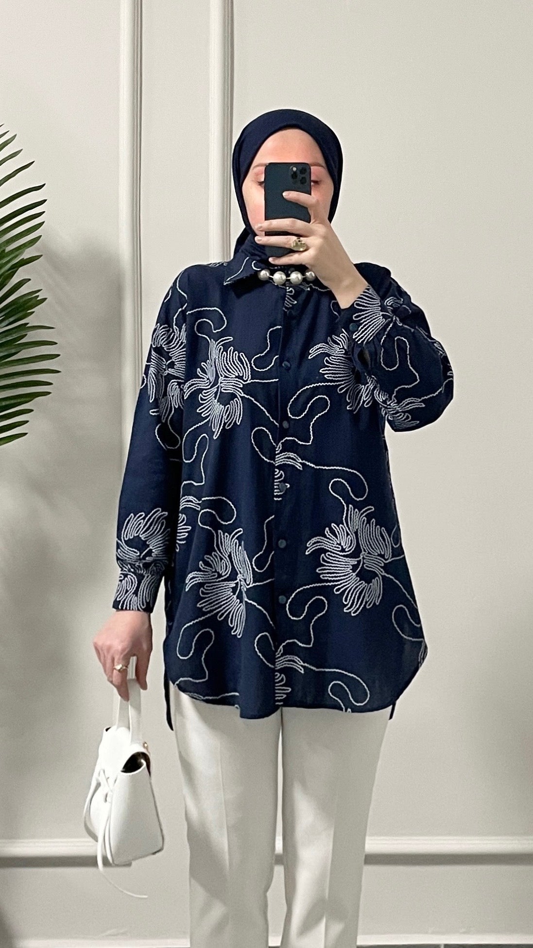 Keten Çiçek Desenli Gömlek Lacivert