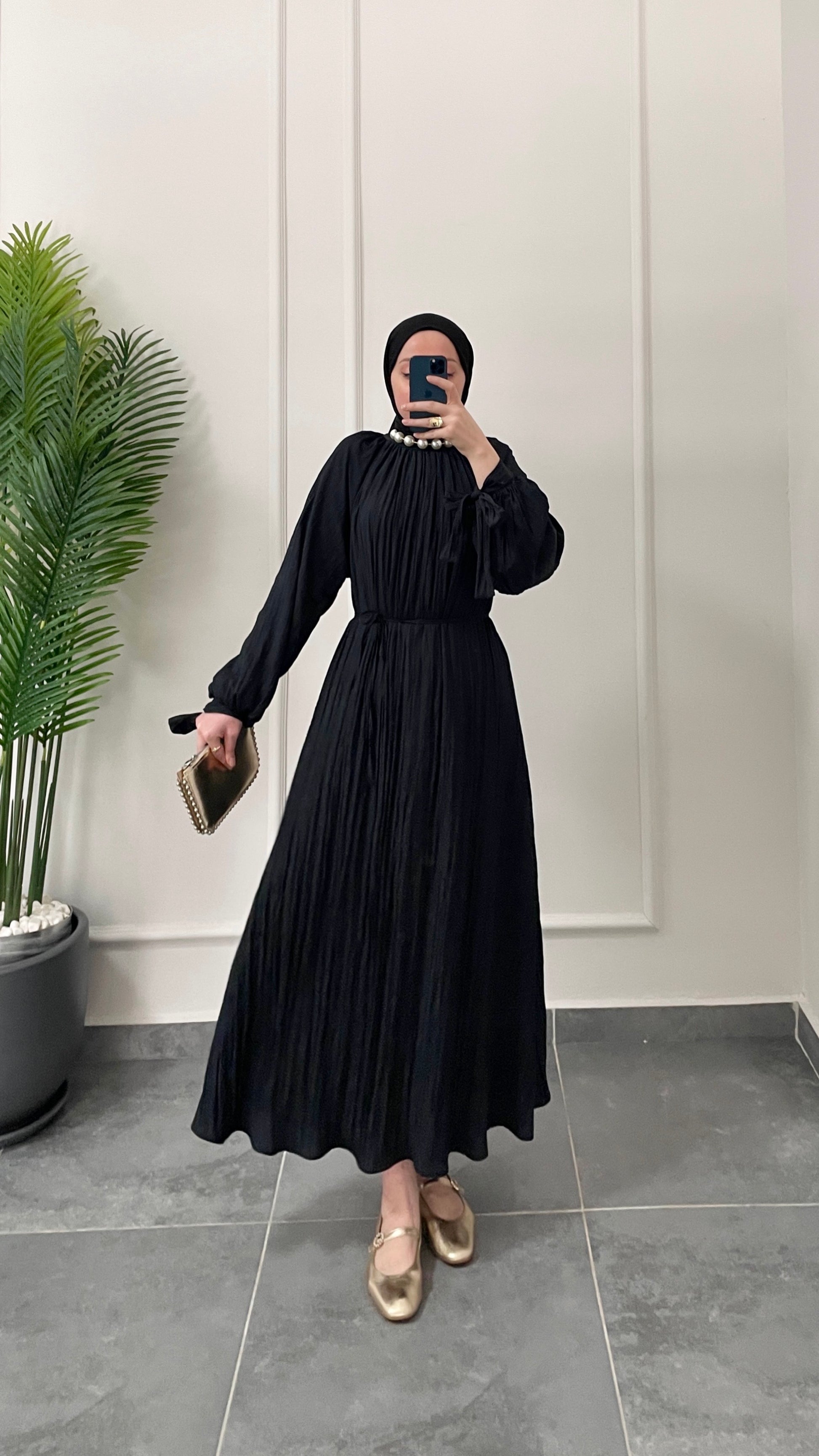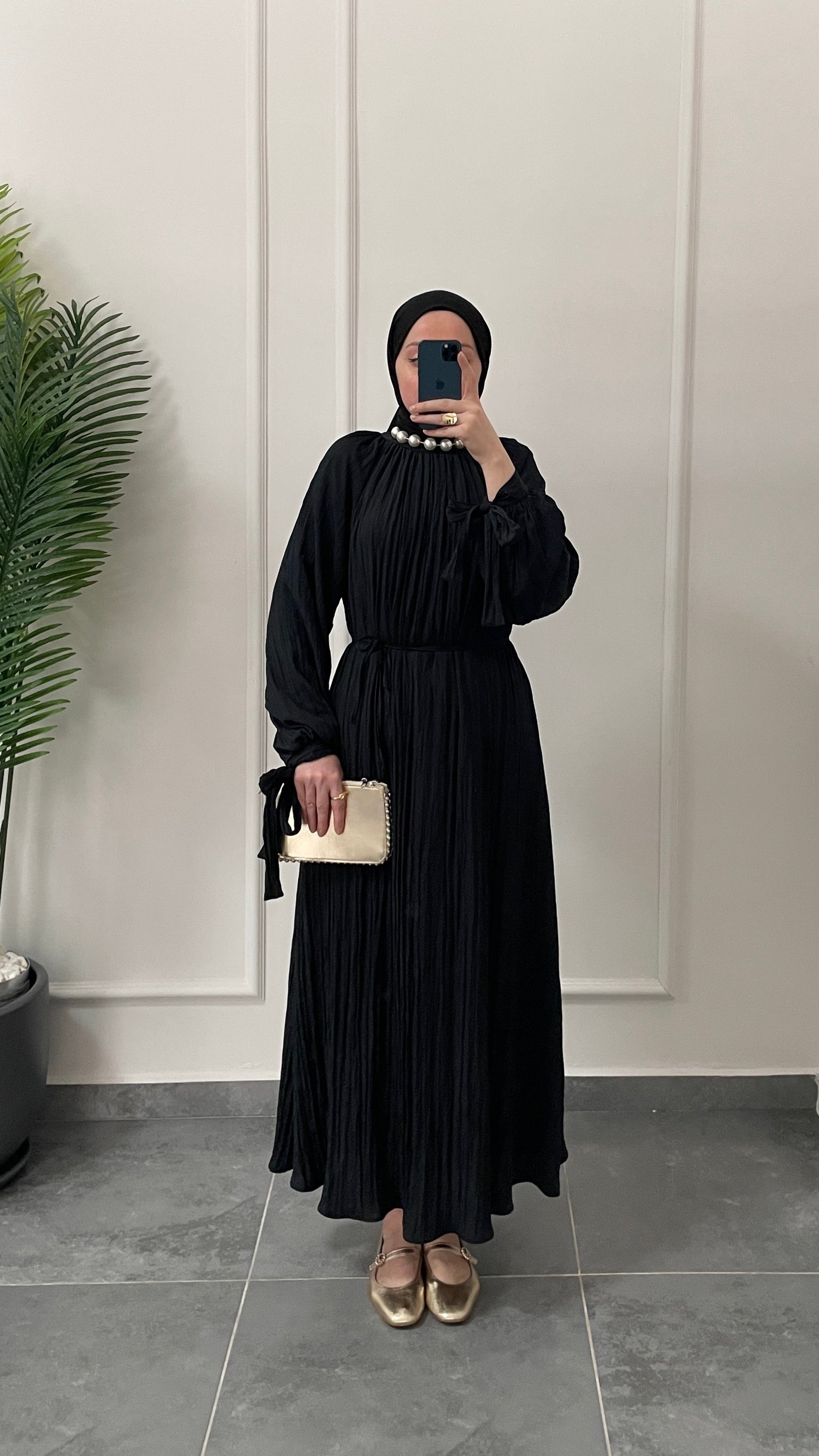 Kollar Bağcıklı Vual Saten Pamuk Elbise Siyah