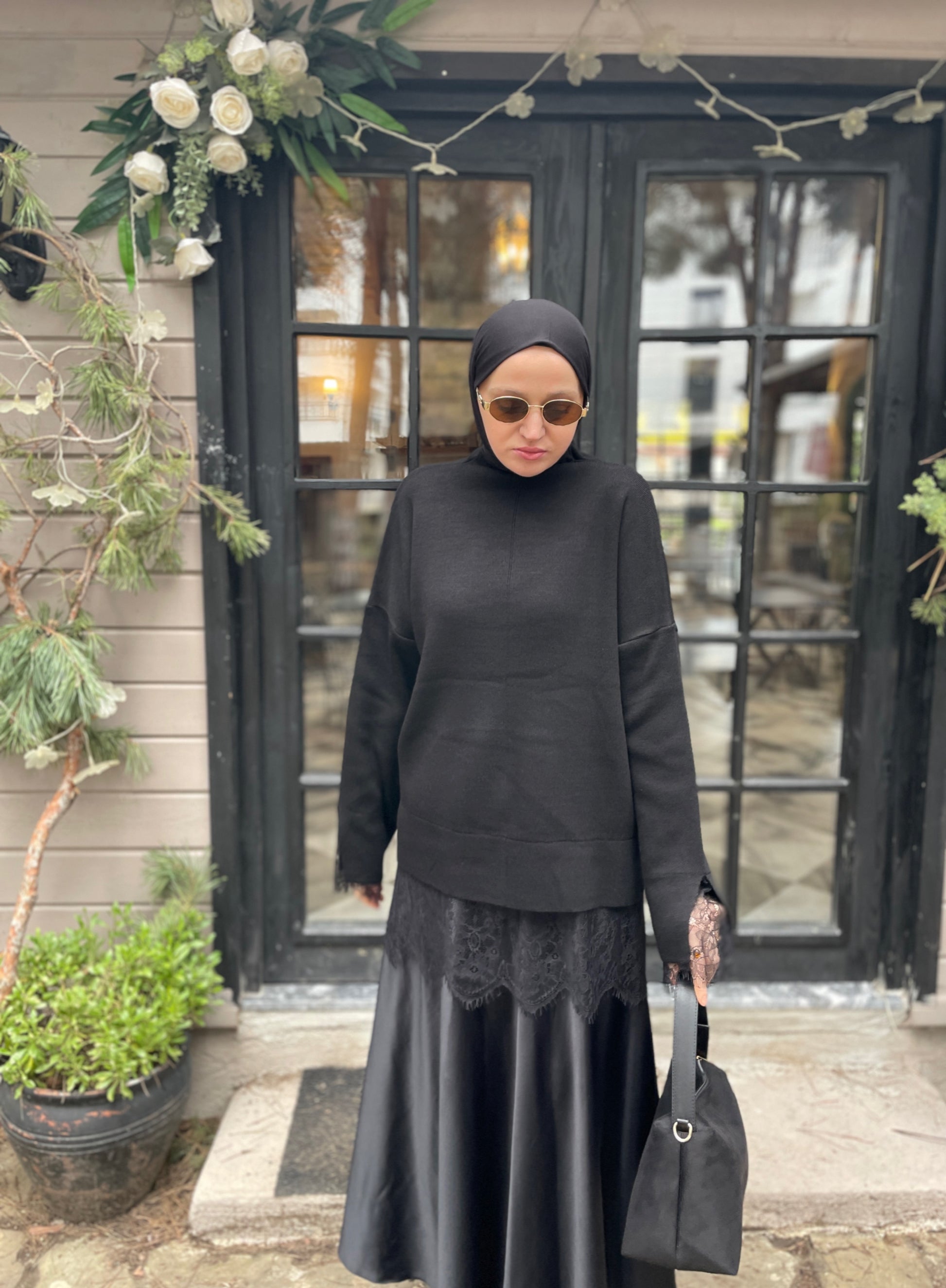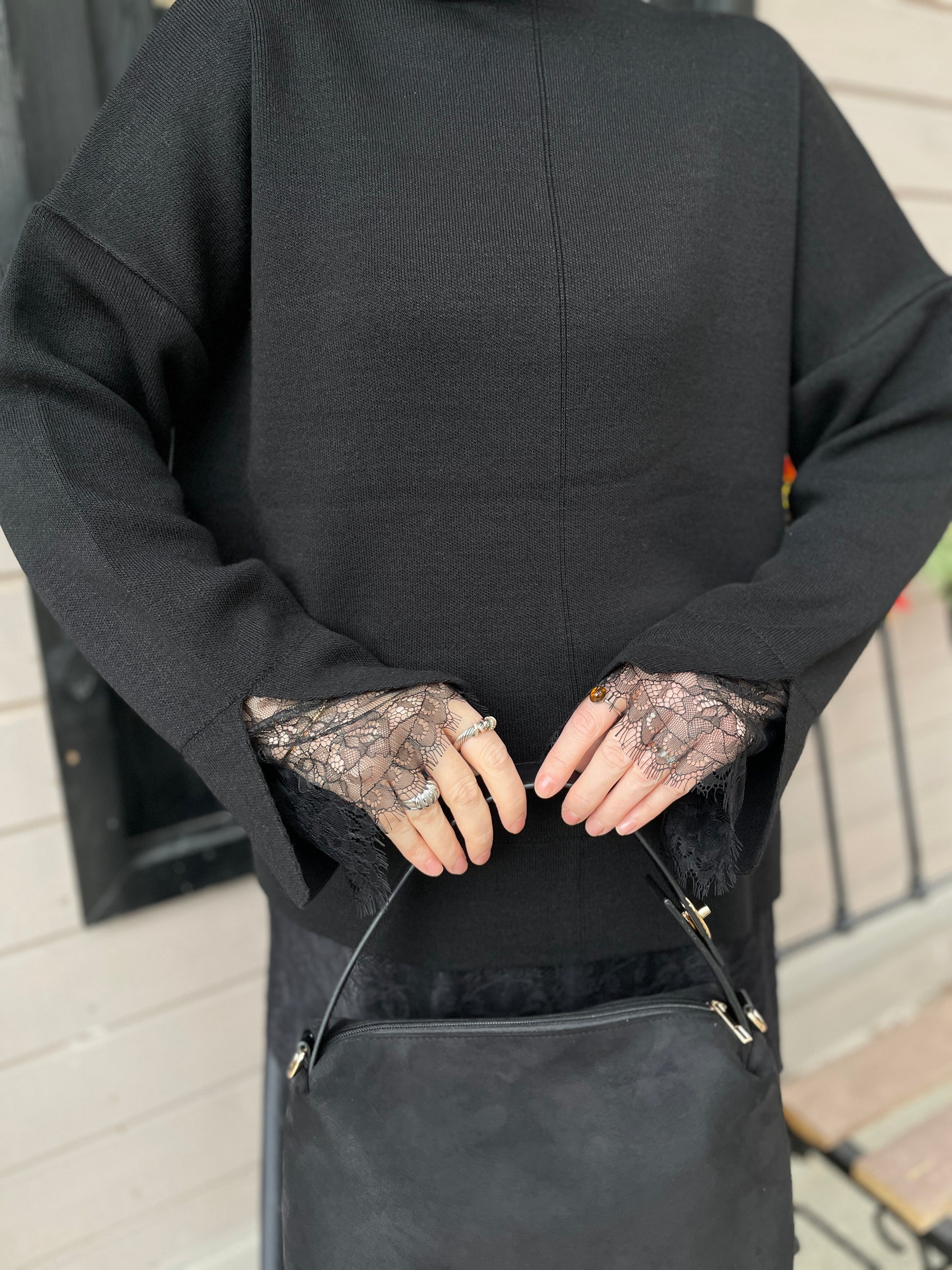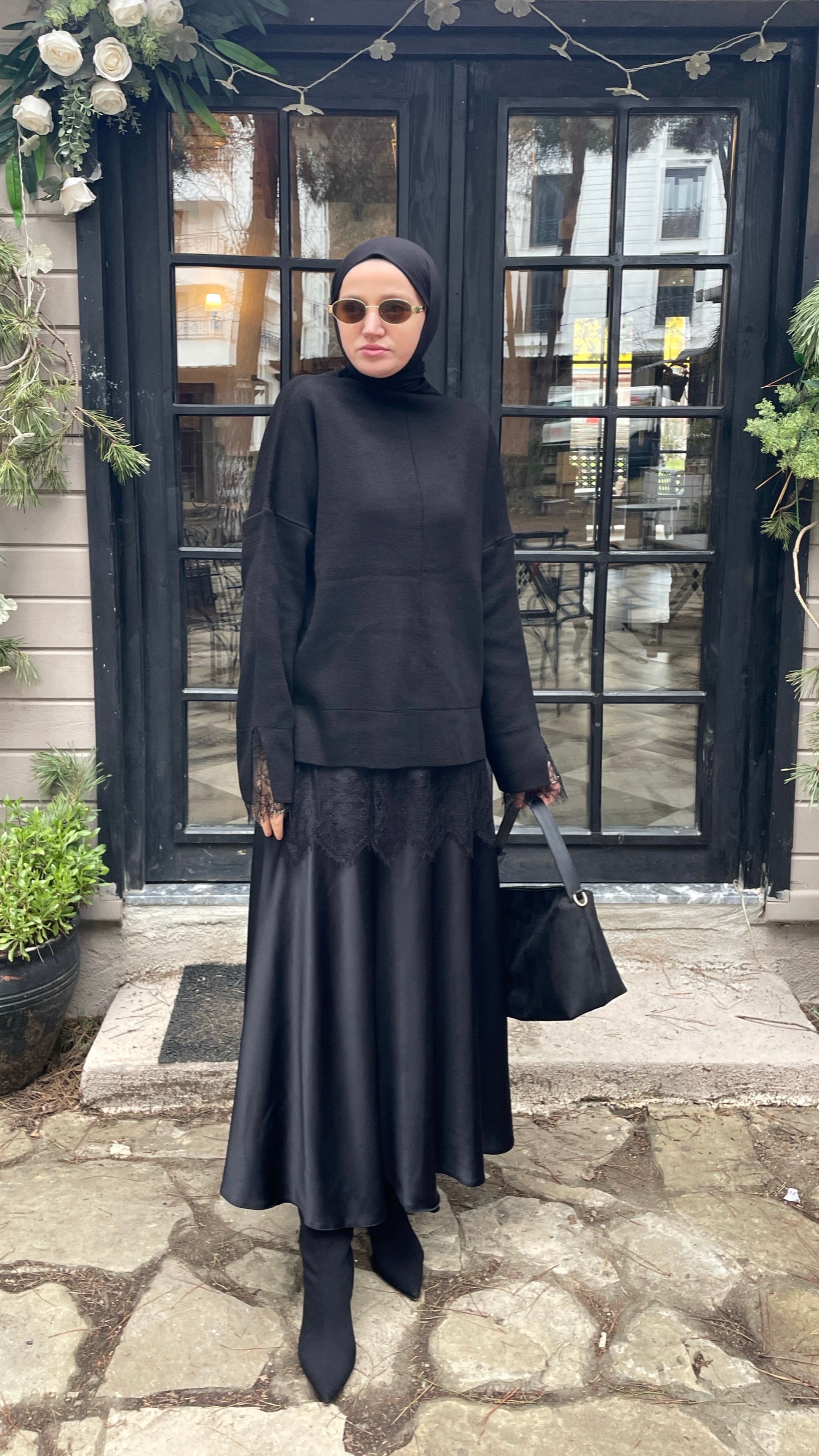 Kollar ve Etek Ucu Dantelli Kazak Siyah