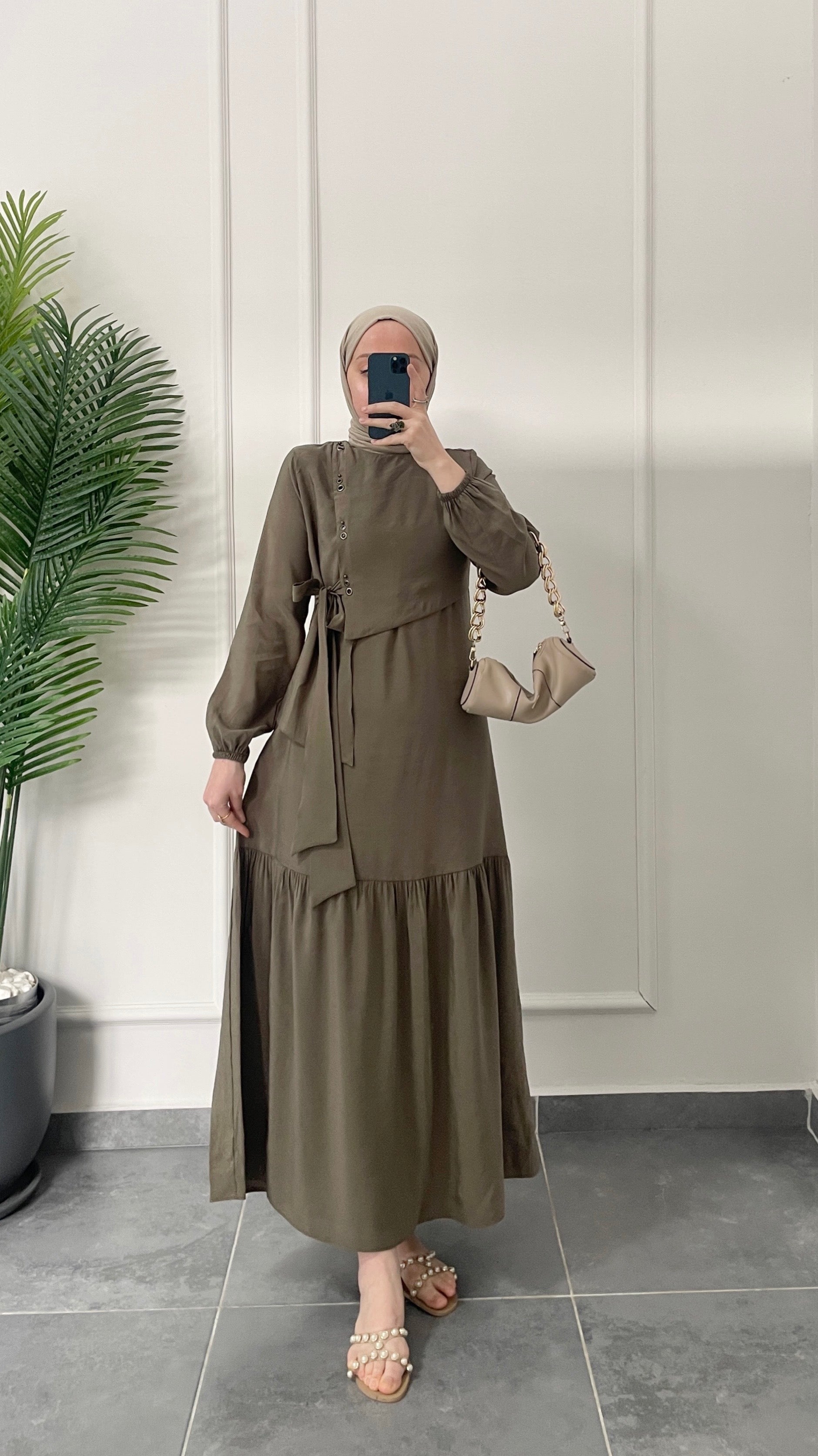 Lora Kuş Gözü Tasarım Elbise-Haki