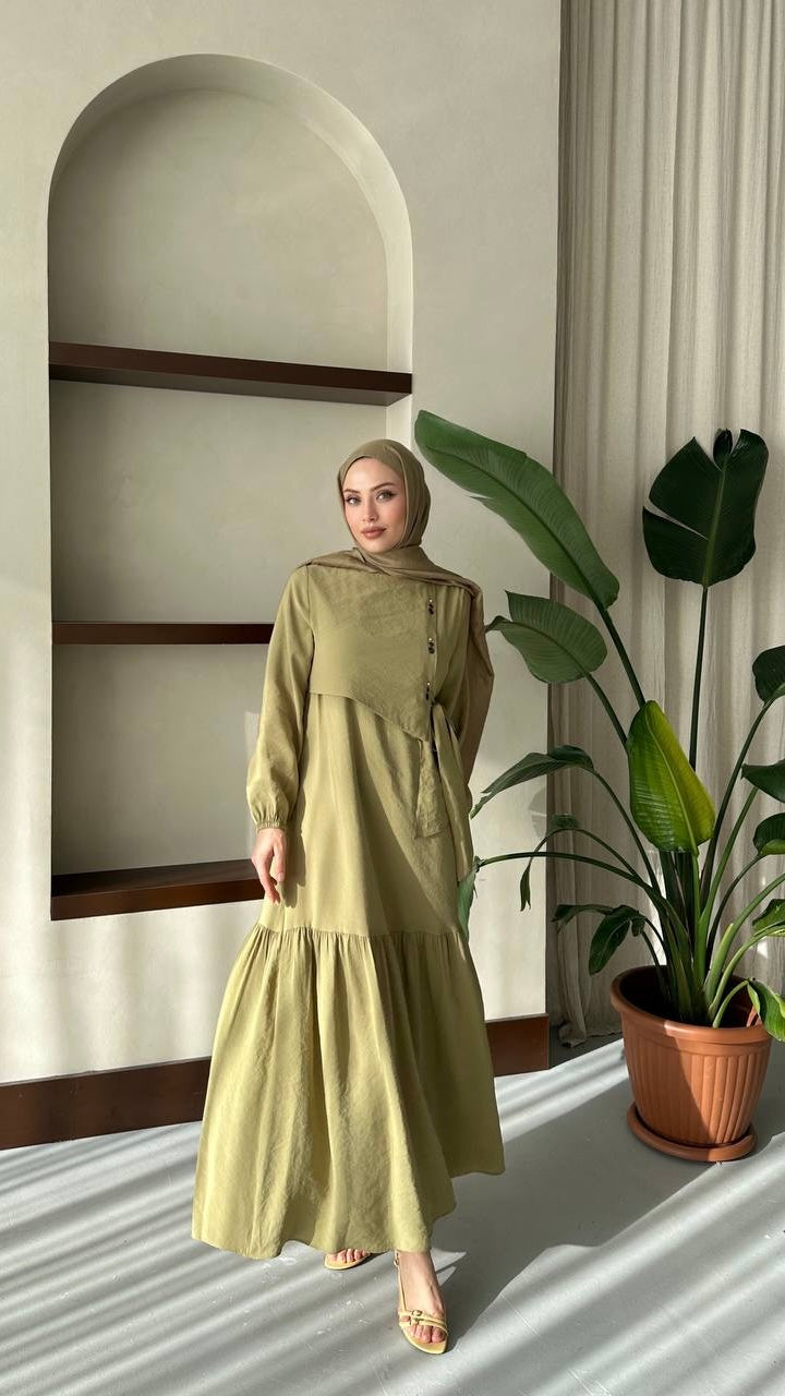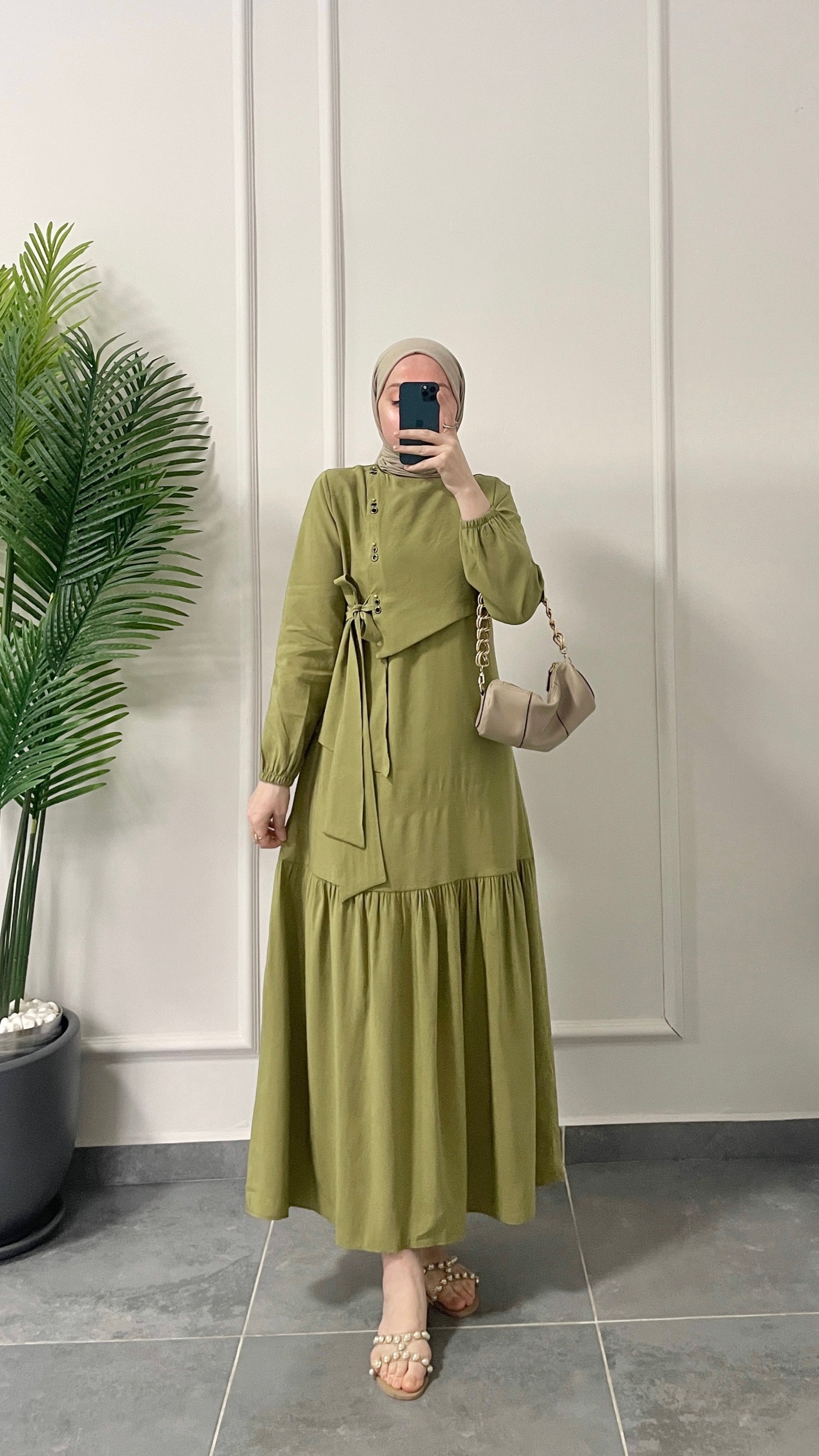 Lora Kuş Gözü Tasarım Elbise-Yağ yeşili