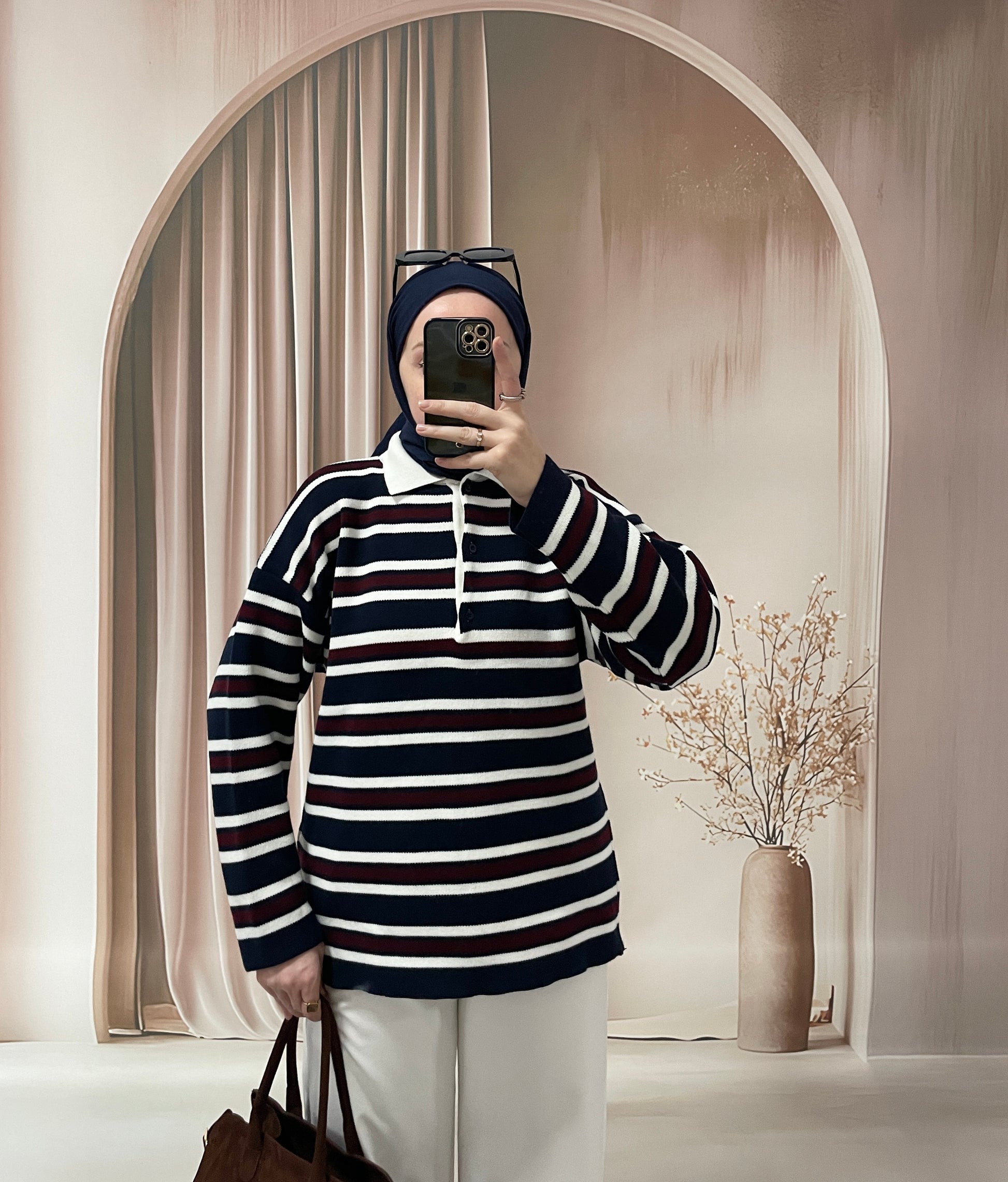 Polo Yaka Çizgili Triko Kazak Lacivert