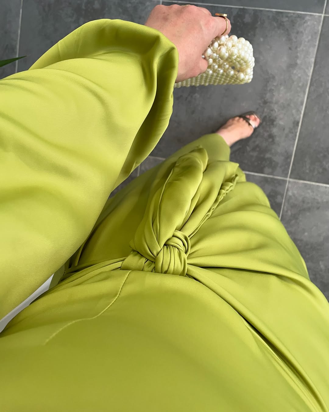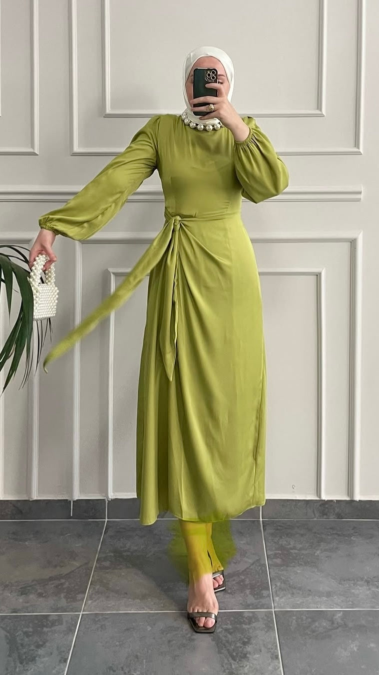 Şura bel bağlamalı saten elbise Yağ Yeşili