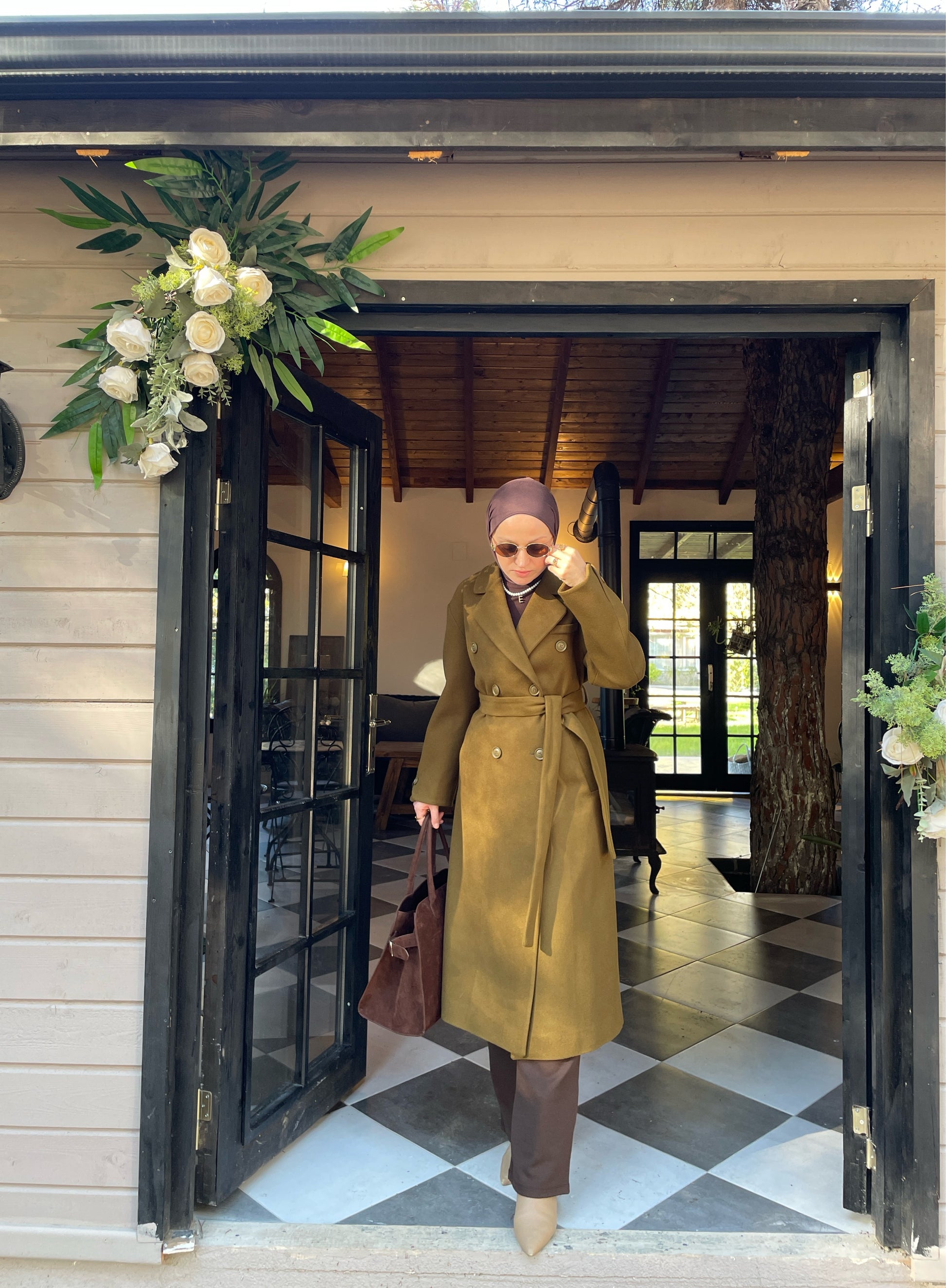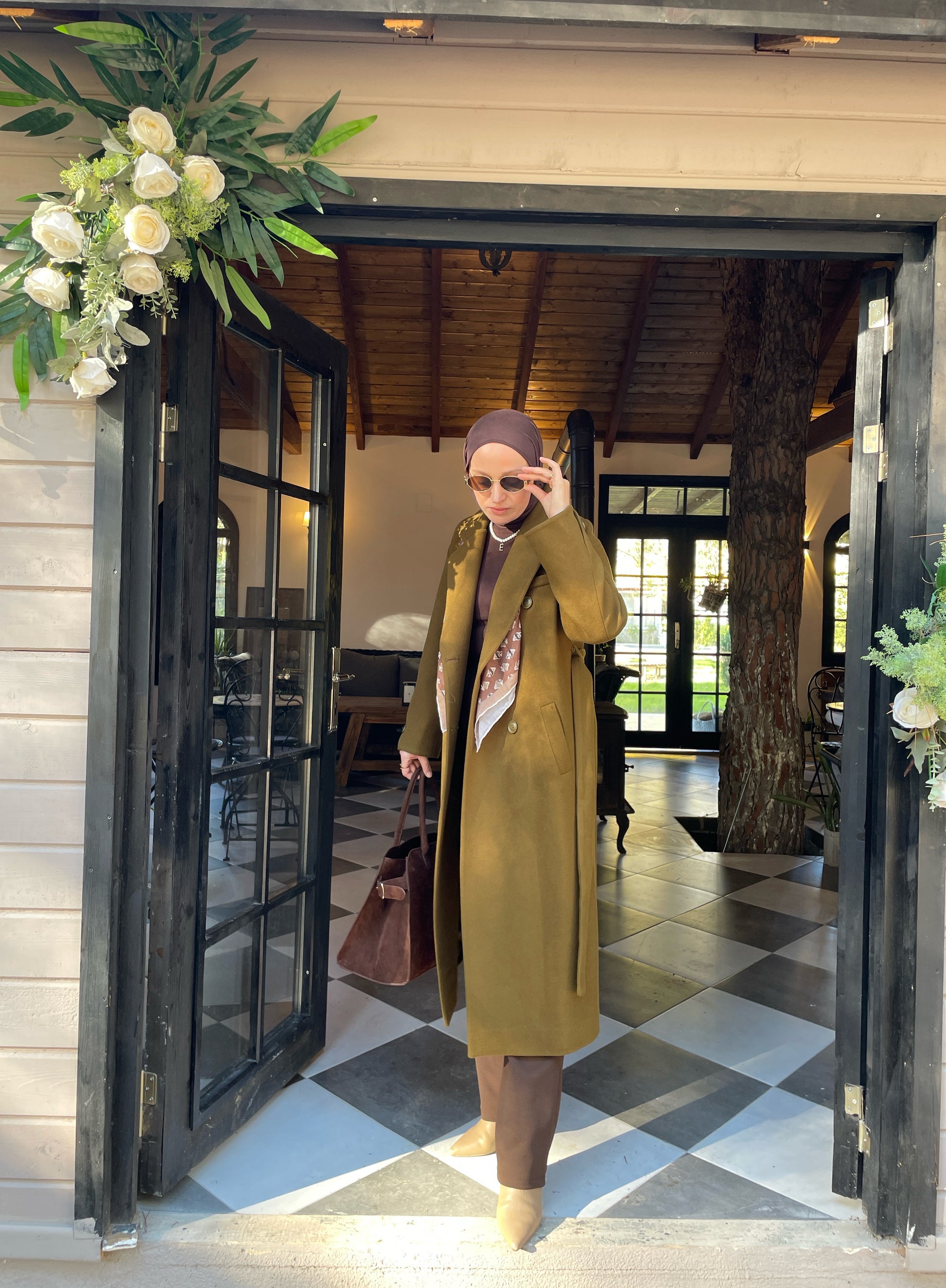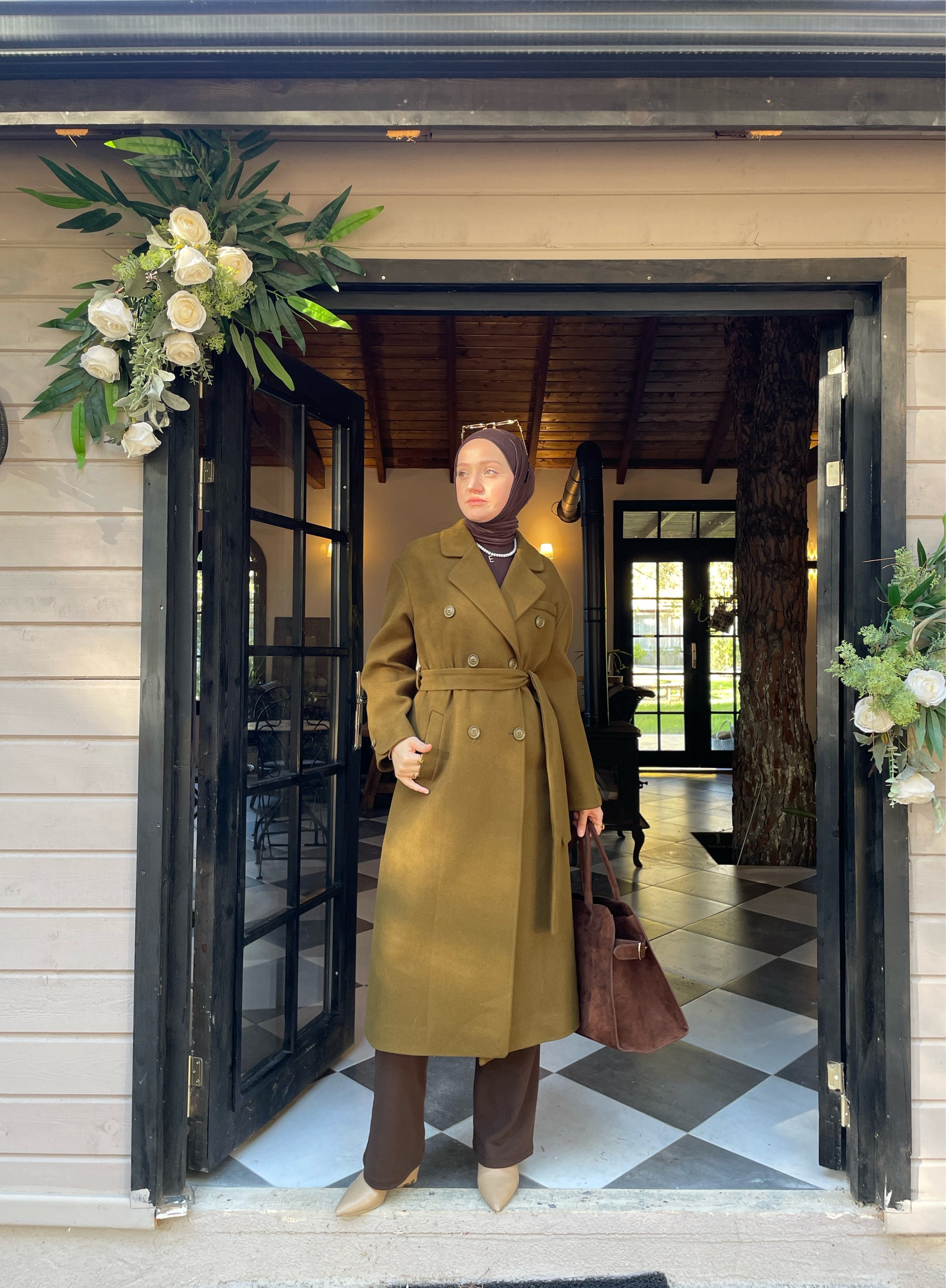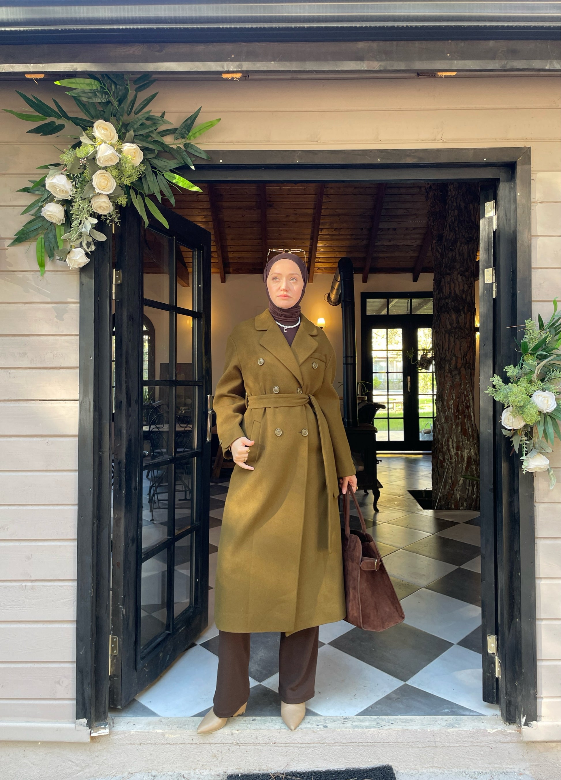 Vintage Tasarım Kol Düğmeli Kaşe Kaban Zeytin Yeşili